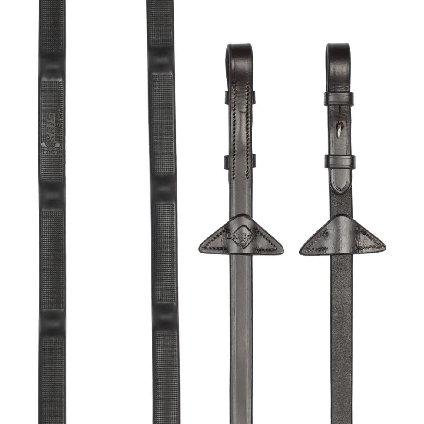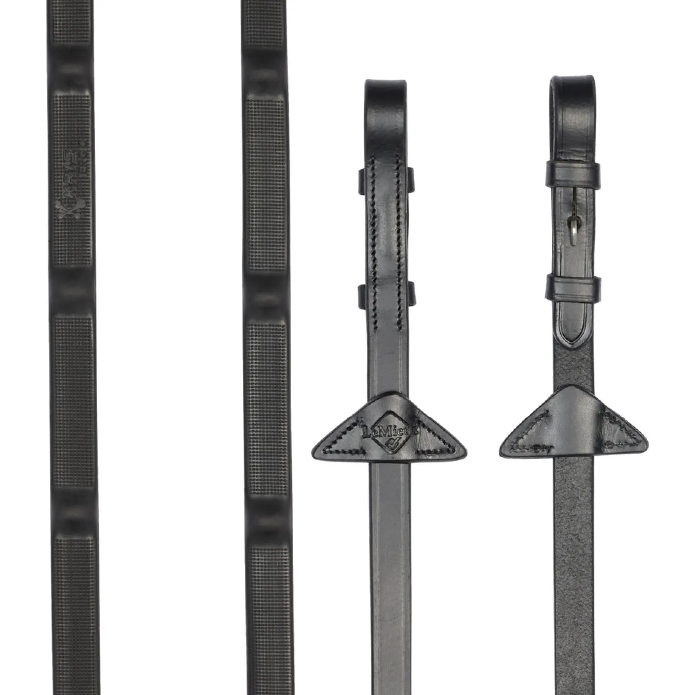 These premium quality low profile rubber reins have integrated raised rubber stoppers for the ultimate traction. Fine textured grippers run between the stoppers for added grip. These reins have billet bit attachments and signature LeMieux stamped leather martingale stoppers.