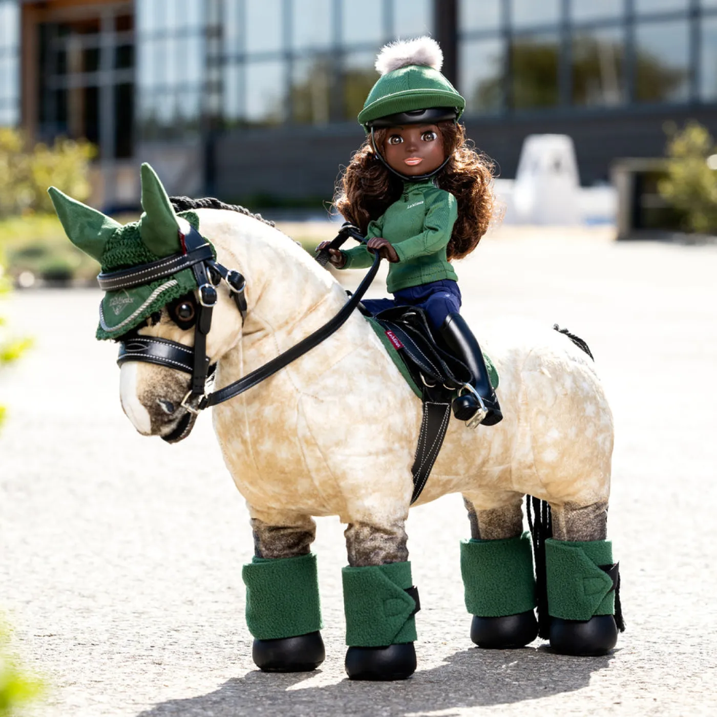 One of several interactive, fully articulated, high-quality equestrian dolls with individual personalities and matching outfits in LeMieux core colours. Creative and artistic Maya adds flair to everything she does, she enjoys mixing and matching her looks to her horse. Maya has luscious, real-feel, brushable long dark hair and natural eyelashes. She comes wearing removable replica LeMieux riding wear in Hunter Green, with a removable riding helmet and boots.