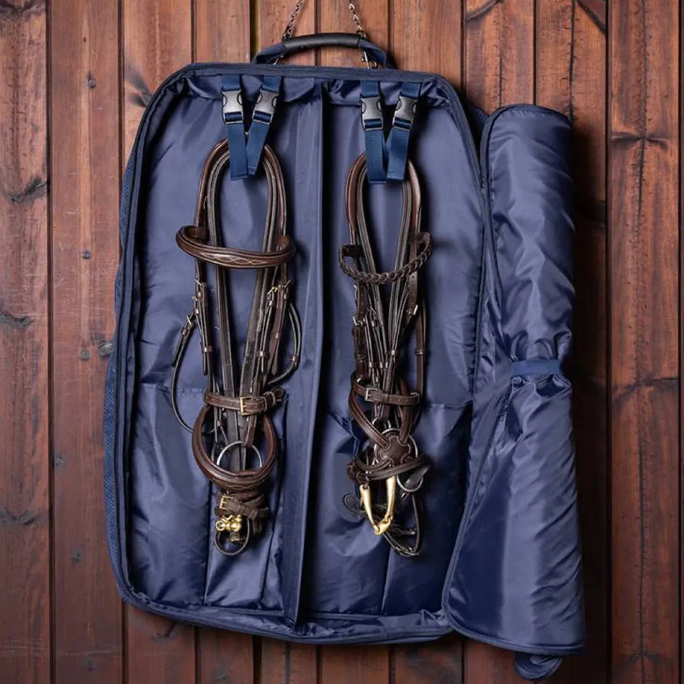 This smart luggage item stores, protects and carries two bridles, with a top hook for easy hanging anywhere. Inside, you’ll find internal hanging clips for two bridles and a padded divider to keep them separated. The double zip opening and mesh air vents ensure air circulation to prevent moisture build-up, which is vital for the care of bridle leather. A durable top carry handle and an elastic hold-back for the front flap make it easy to use, while a generous front zip pocket and multiple internal pockets are handy storage for bits and other small accessories.