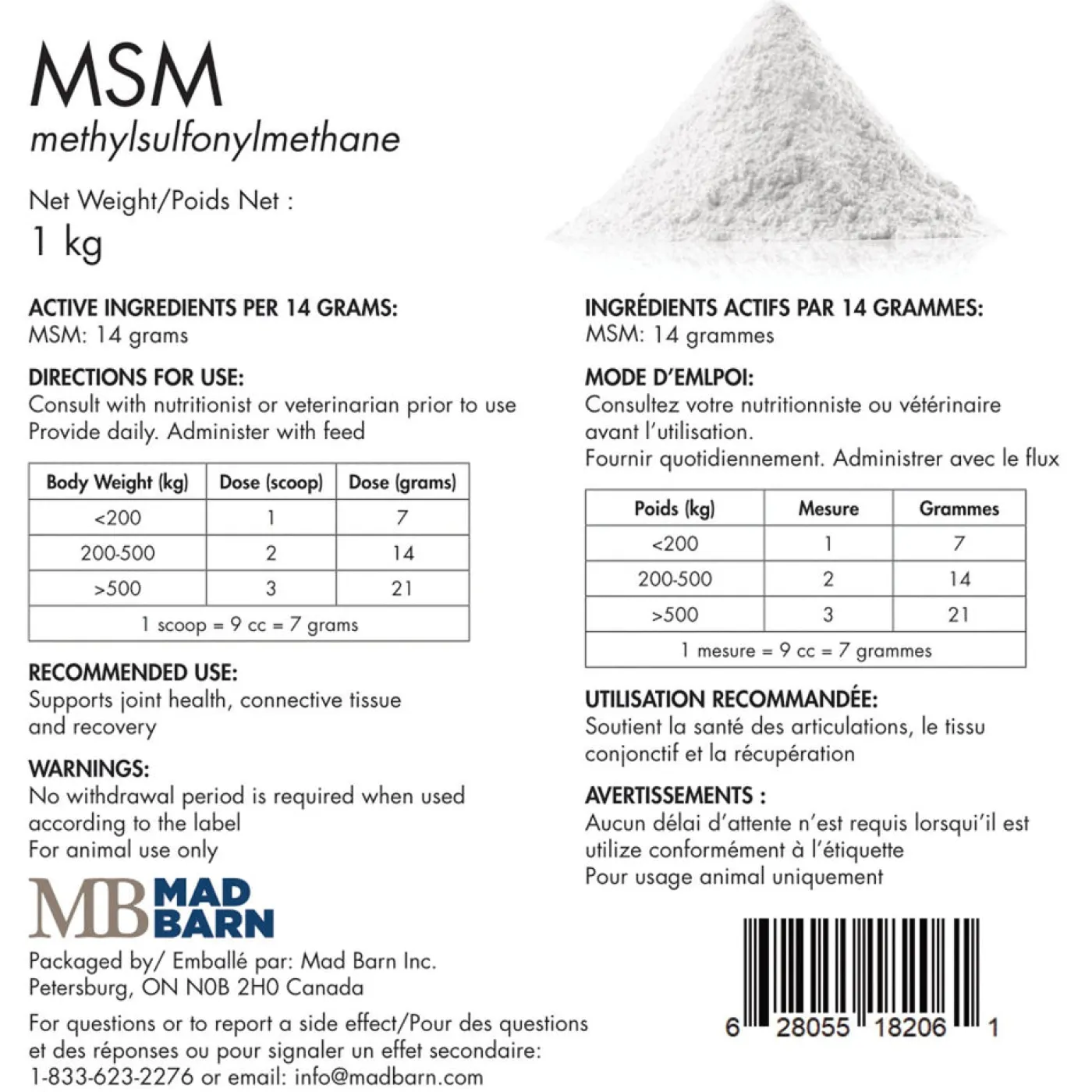 Mad Barn MSM is an equine supplement used to promote joint comfort, healthy connective tissue, and recovery from exercise. Helps to relieve sore muscles and supports healthy skin, coats, and hooves in horses.