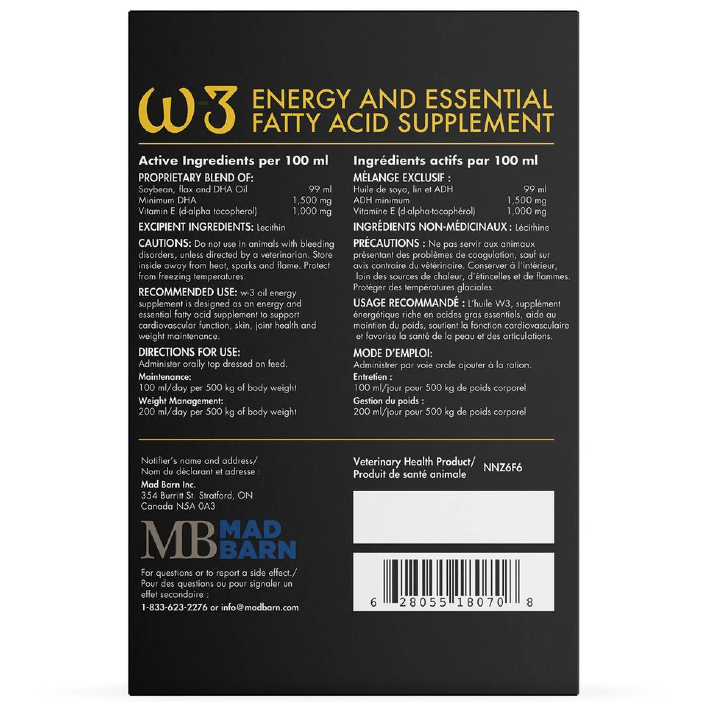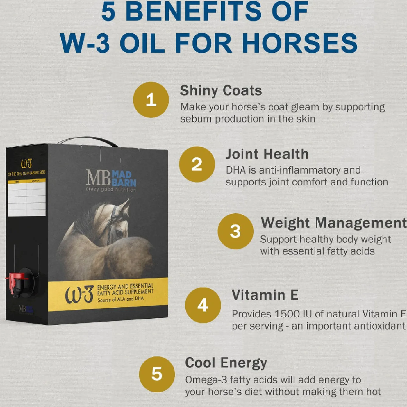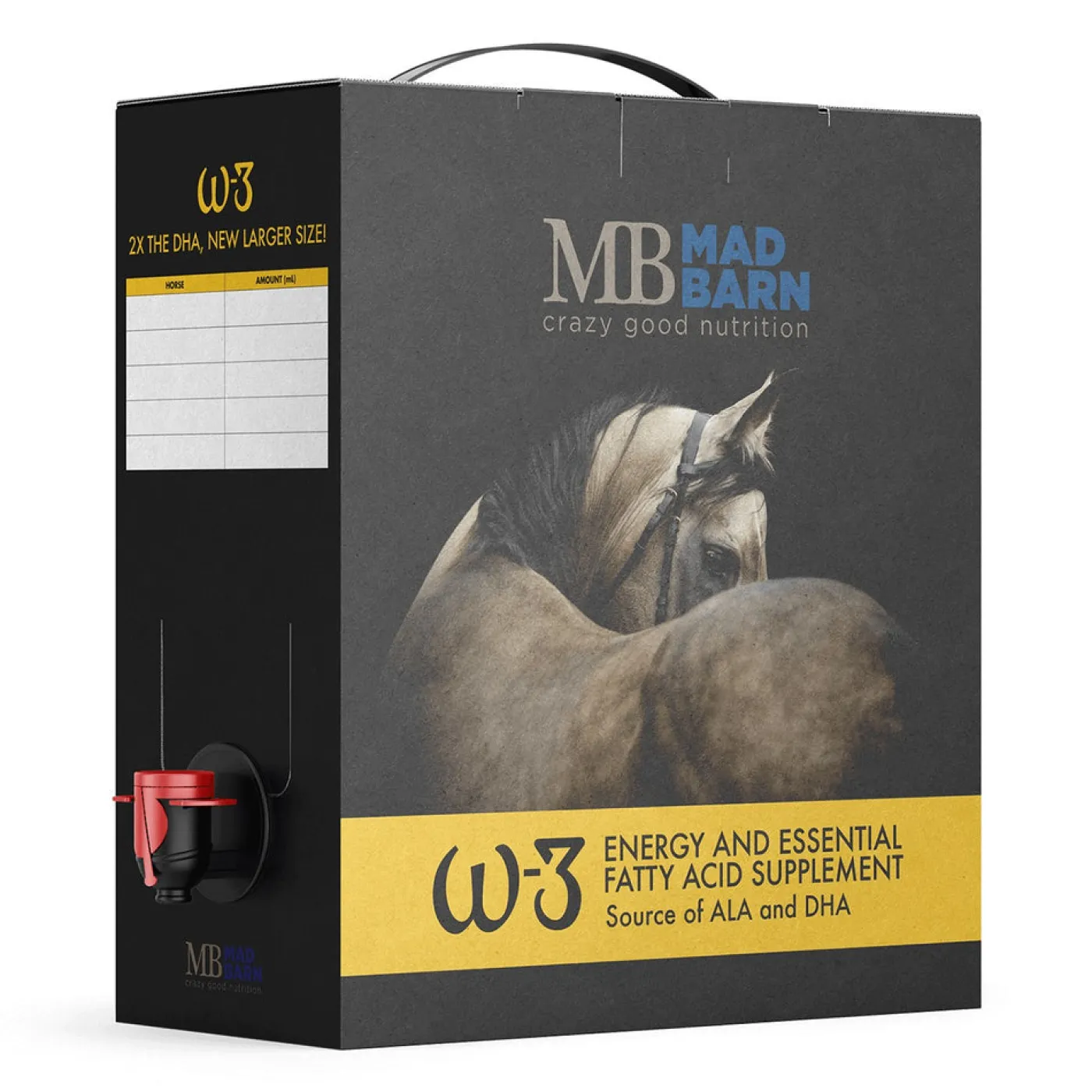 Mad Barn W3 Oil is an essential fatty acid and equine energy supplement that helps to support your horse’s cardiovascular function, skin and joint health, and weight maintenance. Helps to provide the omega-3 benefits of fish oil without the smell and taste.