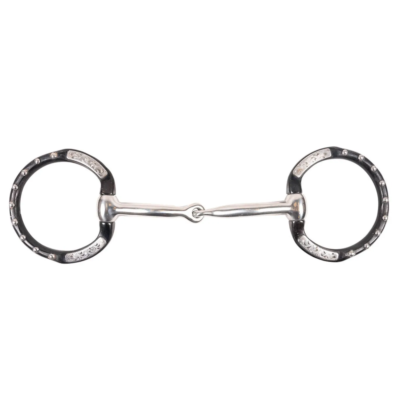The Metalab Antique Eggbutt Snaffle Bit W/ Engraved Overlay features a single jointed, slightly curved, stainless steel mouthpiece. The single jointed mouthpiece creates tongue pressure. The fixed eggbutt cheeks will not slide through the horse’s mouth or pinch. Cheeks have an antique finish and eye-catching engraved detailing. Direct action bit without leverage.