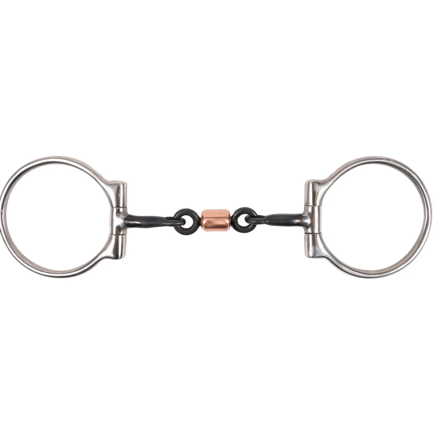 The Antique Offset Dee Ring Bit W/ Copper Roller features a double jointed mouthpiece with an antique finish. The double jointed mouthpiece features a copper roller and provides tongue relief. Copper encourages salivation and helps to soften the mouth. The dee ring cheeks will not slide through the horse’s mouth. The offset dee applies pressure to the lip on the opposite side of the horse’s mouth when the rein is pulled making it a great choice for horses who struggle with steering or connection through turns. Direct action, no leverage.