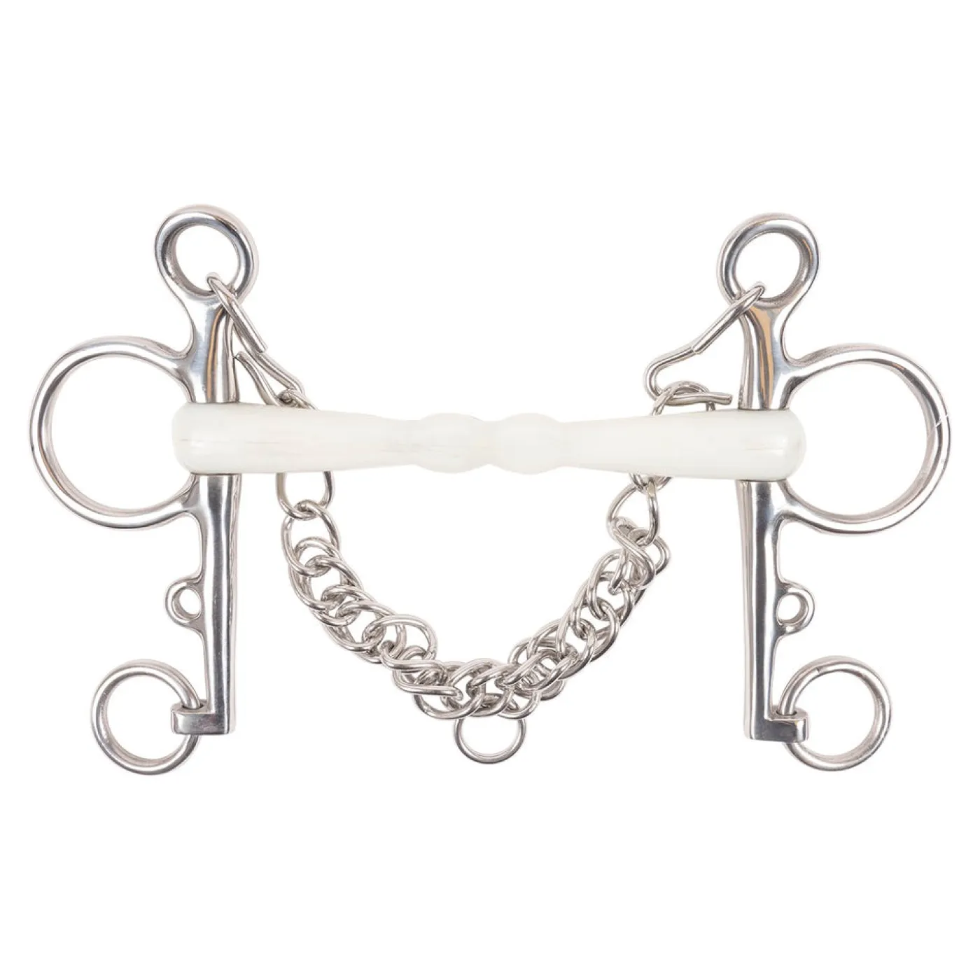 The Metalab Mullen Mouth Flexi Pelham Bit is designed to combine the effects of a snaffle and curb, helping to encourage the horse to bend at the poll through pressure applied by the curb rein. Crafted from a premium quality stainless steel for optimal durability and featuring a softer flexi plastic covering on the mouthpiece for enhanced comfort. Straight mullen mouth and complete with a curb chain.