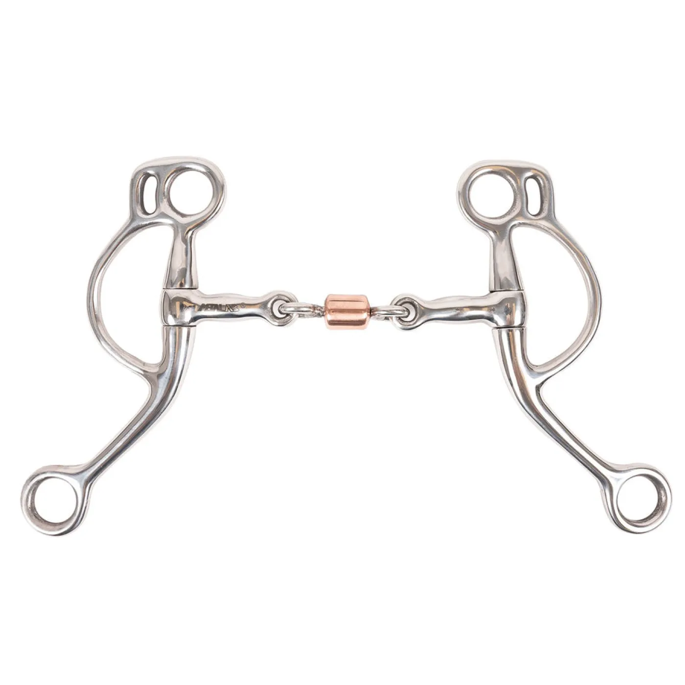 The Metalab Training Pelham Bit W/ Copper Roller features a double jointed mouthpiece with a center copper roller. The copper roller measures 2″ in circumference. The shank is angled away from the horse, and the cheeks swivel freely. Designed to be used with a curb strap. Indirect action with leverage. Cheeks measure 7″ in total length.
