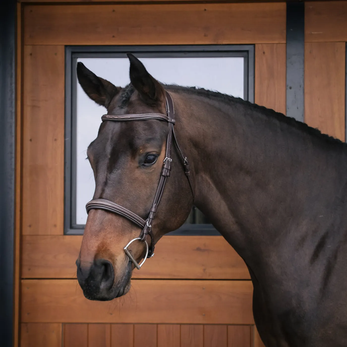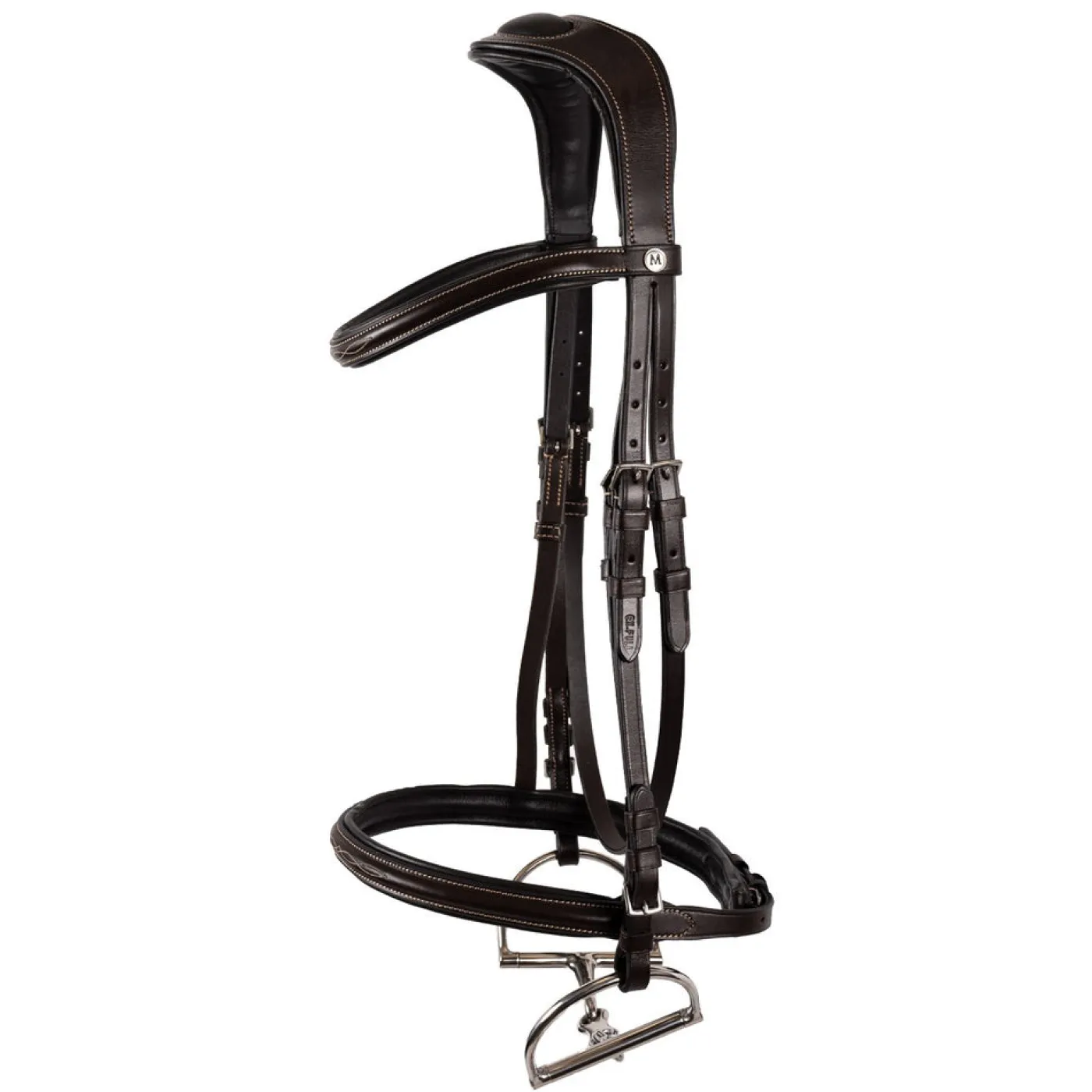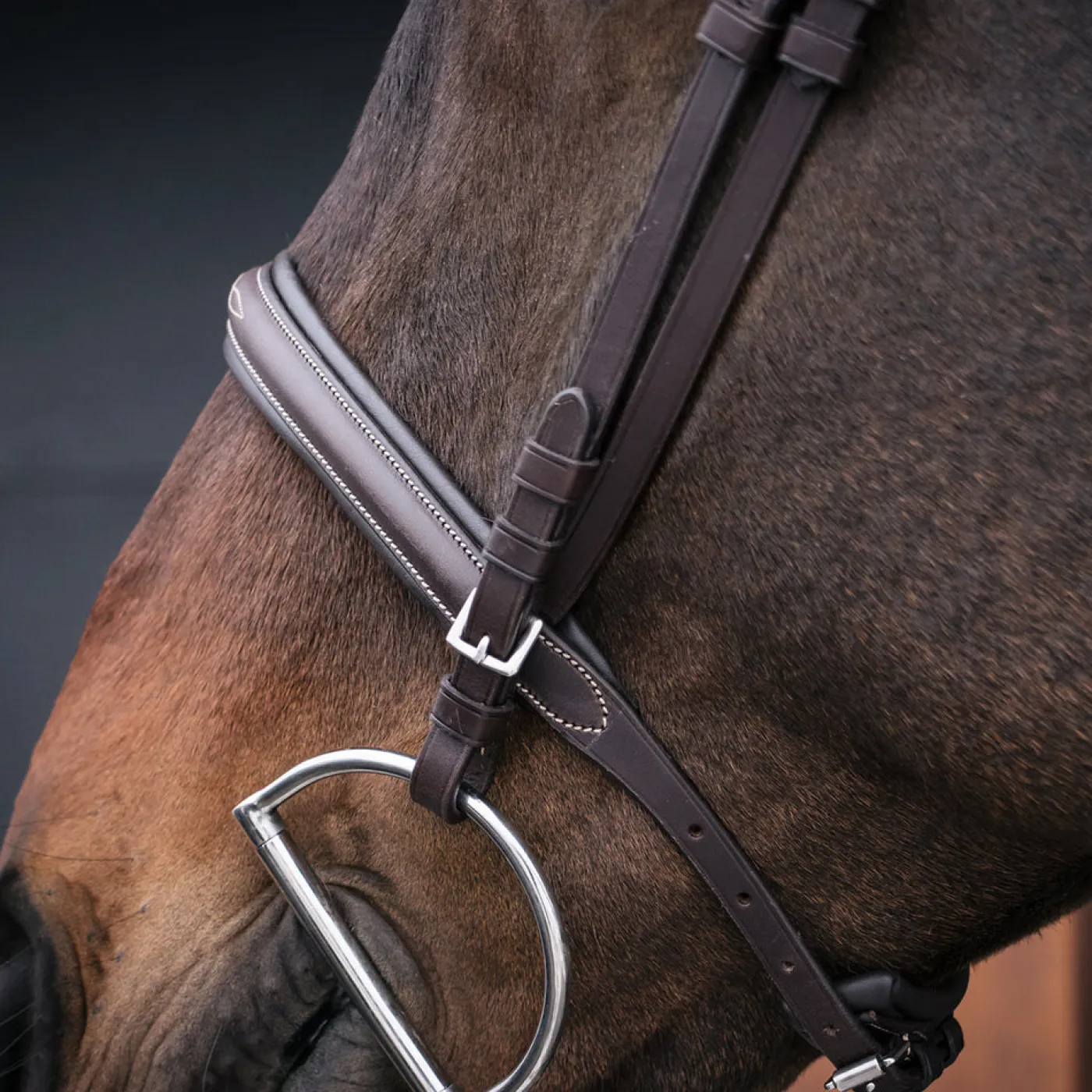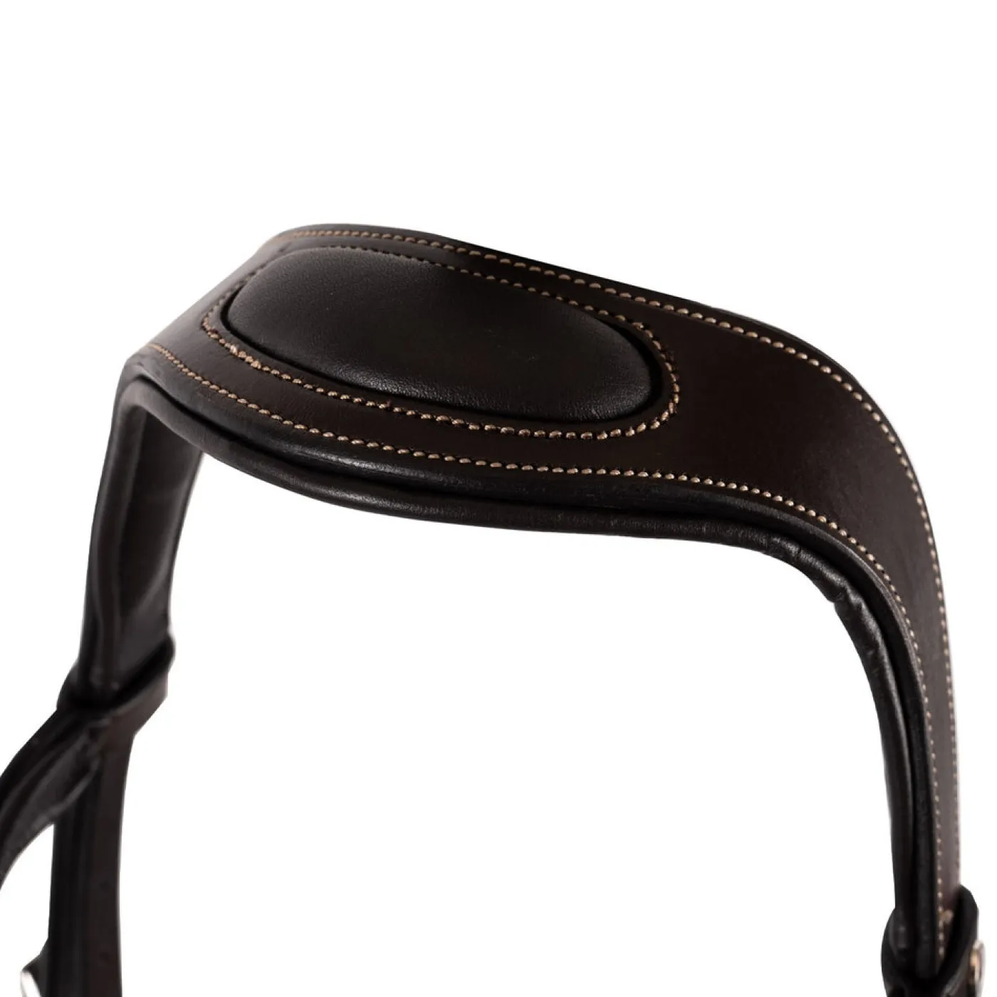 Featuring an anatomically designed, wider crownpiece with an innovative pressure-relief pad over the poll and a butter-soft leather lining. The noseband and browband are finished with detailed contrast stitching and comfortable padding. Buckle end cheekpieces with discreet leather keepers hold the bit in place. Sold without reins. Bit not included.