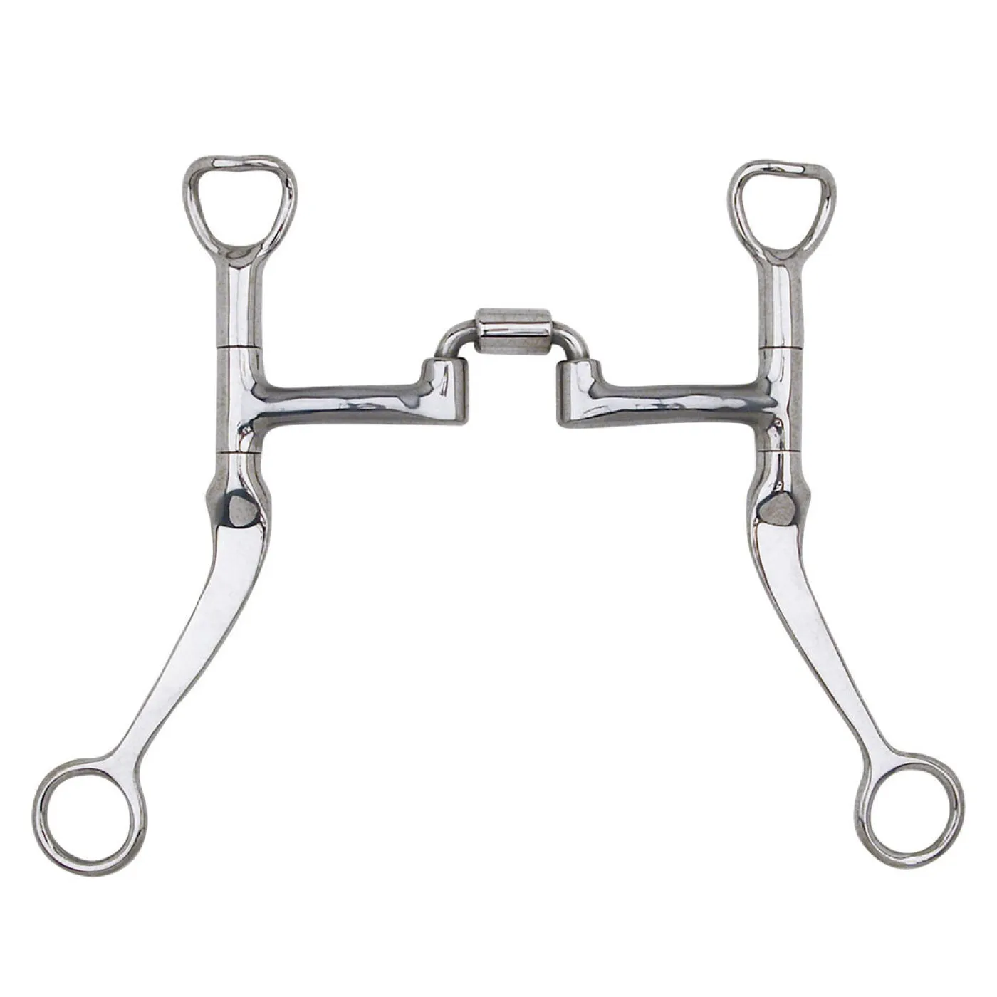 The Myler Flat Shank Bit W/ Correctional Low Port features an MB 27PB mouthpiece. The MB 27PB is a Myler correctional mouthpiece, which is a ported mouthpiece that collapses onto the outer lip and bars, and rotates on to the tongue. The port although narrow and somewhat low, allows room for the horse’s tongue to pass under the bit. When the reins are engaged and the mouthpiece rotates on to the tongue, it applies two concentrated points of pressure on the tongue for quick control. Because this port is only 1 ¼” high, it will apply little to no palate pressure. Sweet iron mouthpiece oxidizes and encourages salivation. The 7″ Flat Shank is stainless steel and curved slightly back towards the horse, with a flat-top purchase and a rein ring. The mouthpiece has a fixed attachment. The Flat Shank has the patented Independent Swivel Cheek where the purchase, mouthpiece, and shank all move independently of each other. The purchase is slightly angled away from the cheek to avoid rubbing. It has an indirect (curb) rein action designed to be used with a curb strap which attaches to the purchase. The Flat Shank uses the combination of the fixed cheek and fixed rein to apply pressure to the mouth, chin, and poll. Indirect action with moderate leverage. Myler Level 2 to 3.