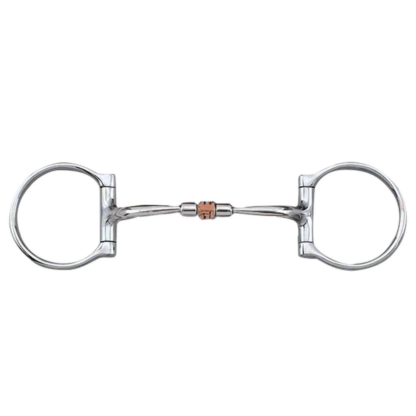 The Myler Western Dee Bit W/ Copper Roller features the MB 03 sweet iron mouthpiece, which oxidizes and encourages salivation. The MB 03 mouthpiece is the Myler alternative to the traditional French link or lozenge mouthpiece commonly used in snaffle bits with an added copper roller. The MB 03 rotates onto the tongue, applying tongue pressure, but because the mouthpiece is curved, it wraps around the bars and lips instead of pinching. The barrel in the center applies approximately the same pressure on the tongue as a traditional three-piece mouthpiece, however, the barrel distributes the pressure more kindly and creates Independent Side Movement™. Complete with stainless steel dee rings with a fixed attachment of the mouthpiece. This traditional cheek style keeps the mouthpiece from draping on the tongue, providing a more direct signal than the loose ring. The straight side of ring will not pull through the mouth and does not pinch.