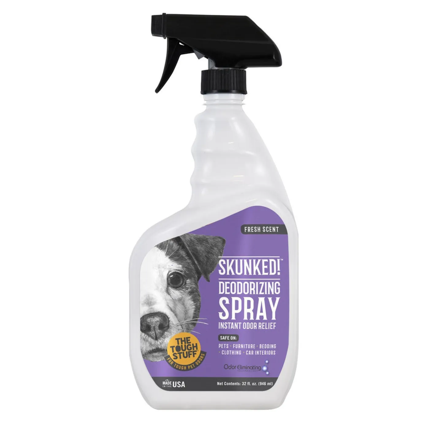 If your pet gets skunked, get rid of pesky odours with NILodor Tough Stuff Skunked Deodorizing Spray! The proprietary formula removes strong odours caused by skunks using a combination of powerful essential oils. Fast acting to provide immediate relief. This handy spray is safe to use directly on your pet and on water-safe materials. Use on carpets, upholstery, car interiors, clothing and bedding too! To use, spray liberally across your pet’s entire coat. Work in thoroughly and let dry. If odour persists, reapply as neccesary. For best results, combine with NILodour Tough Stuff Skunked Pet Shampoo or with NILodour Tough Stuff Skunked Laundry Additive. Complete with a light, fresh scent. Made in the USA. 32 oz.