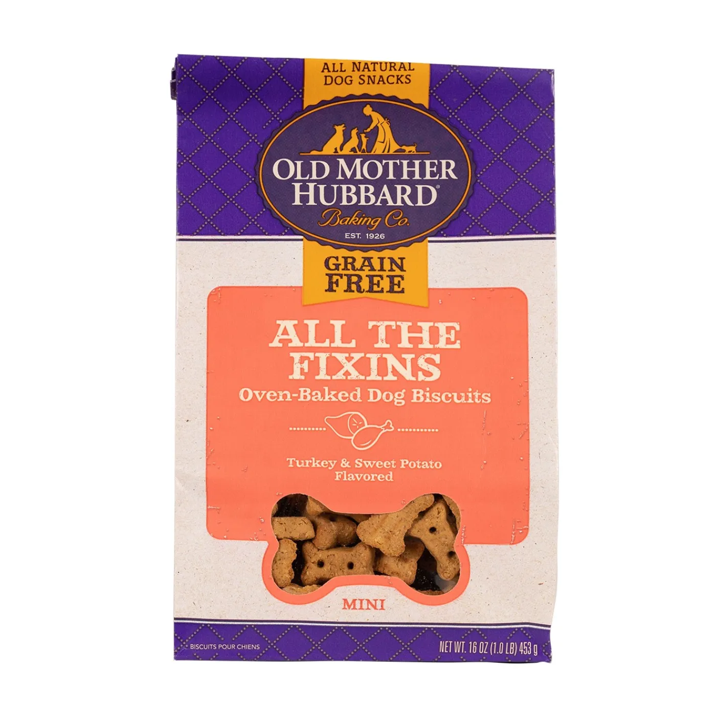 Old Mother Hubbard Dog Biscuits are grain free and oven baked with all-natural ingredients and flavours that your pup will enjoy. “All the Fixins” flavor features flavours of turkey and sweet potato with a delicious crunch. Made with real potatoes, peas, molasses and sweet potato. Suitable for small dogs as a training aid or reward.
