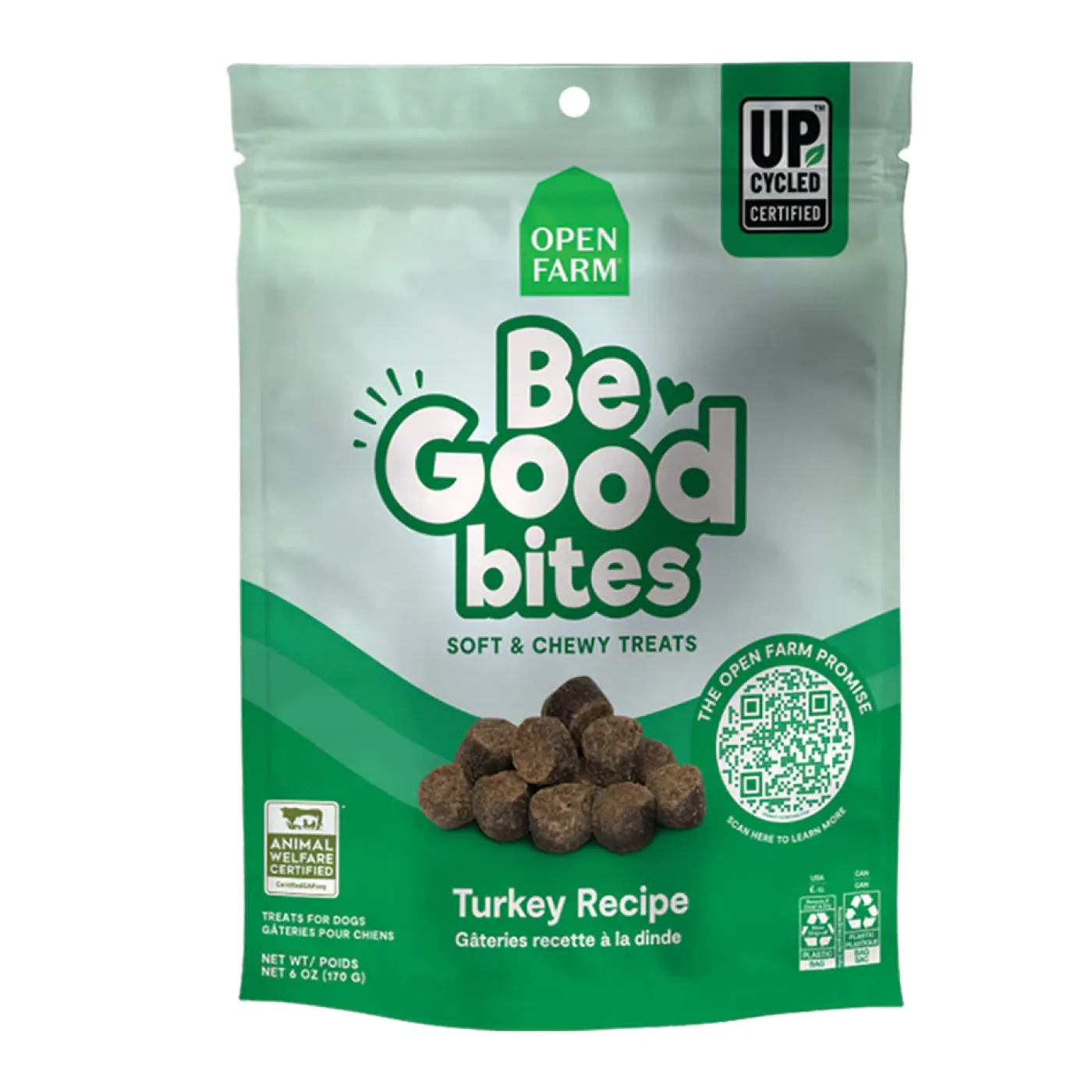 Made with humanely raised turkey as the first ingredient, combined with high-quality non-GMO fruits and grains. These treats included 30% upcycled ingredients, making Be Good Bites great for your pup and the planet too!