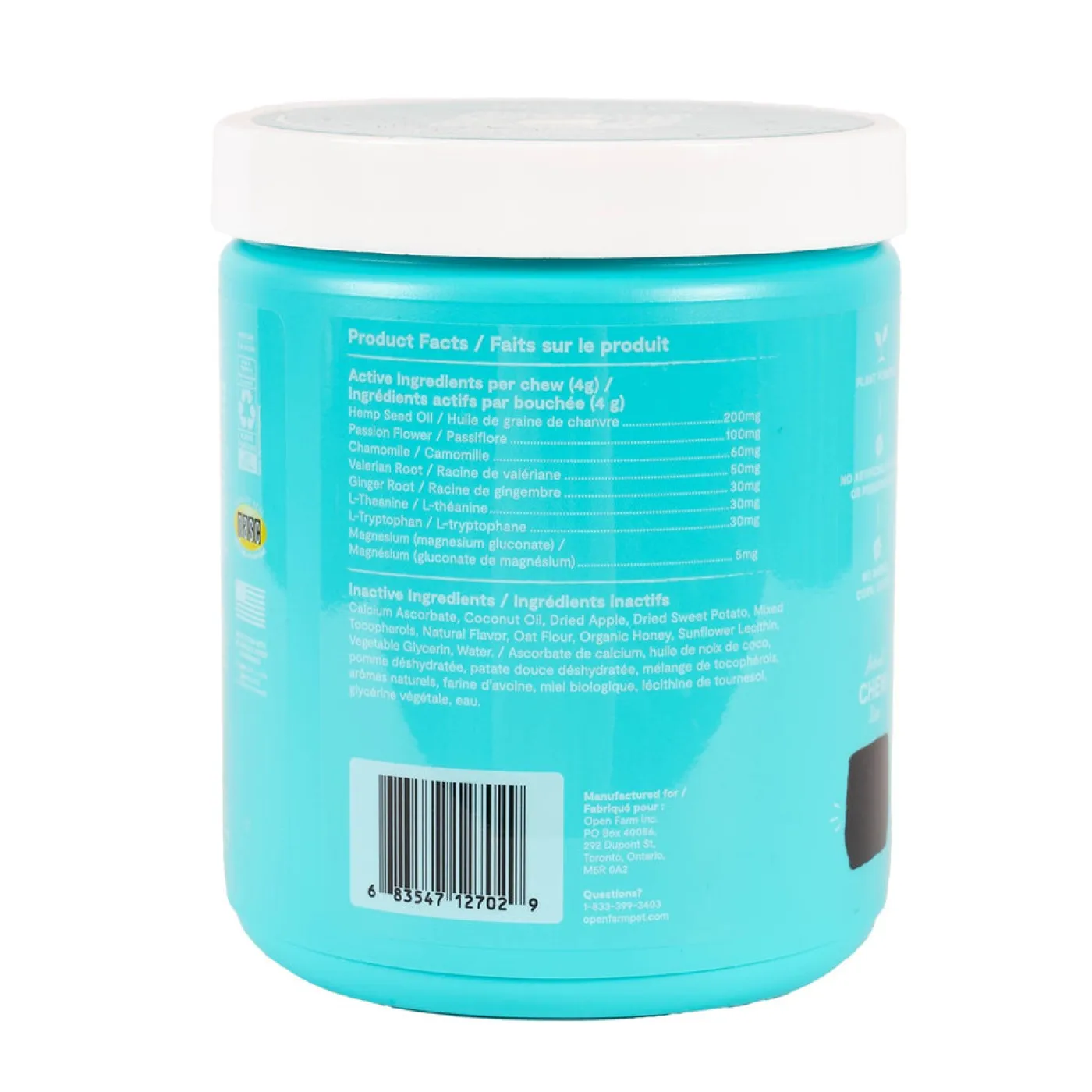 Open Farm Calming Chews provide support for calmness, relaxation and balanced behaviour. Formulated with 100% traceable ingredients. Each package contains 90 oral chews. Packaged in a 100% recyclable resealable jar.