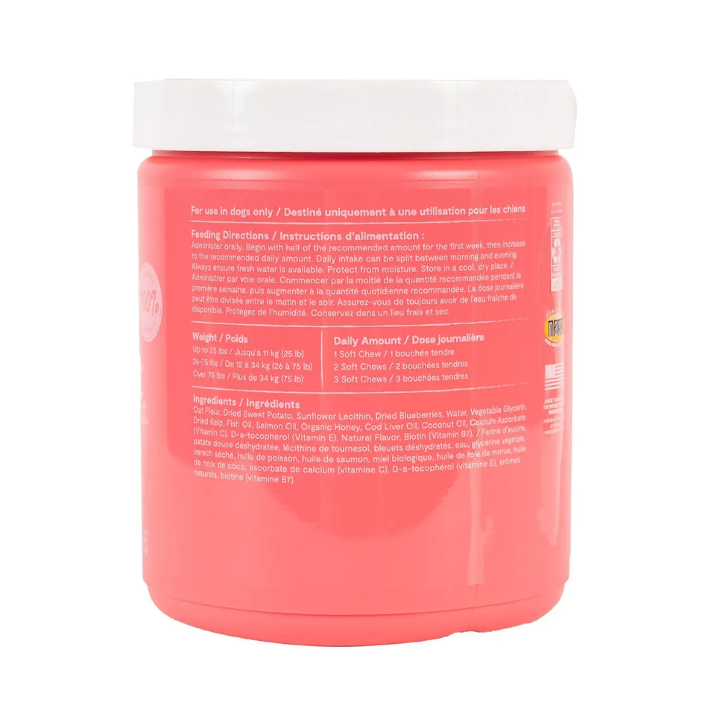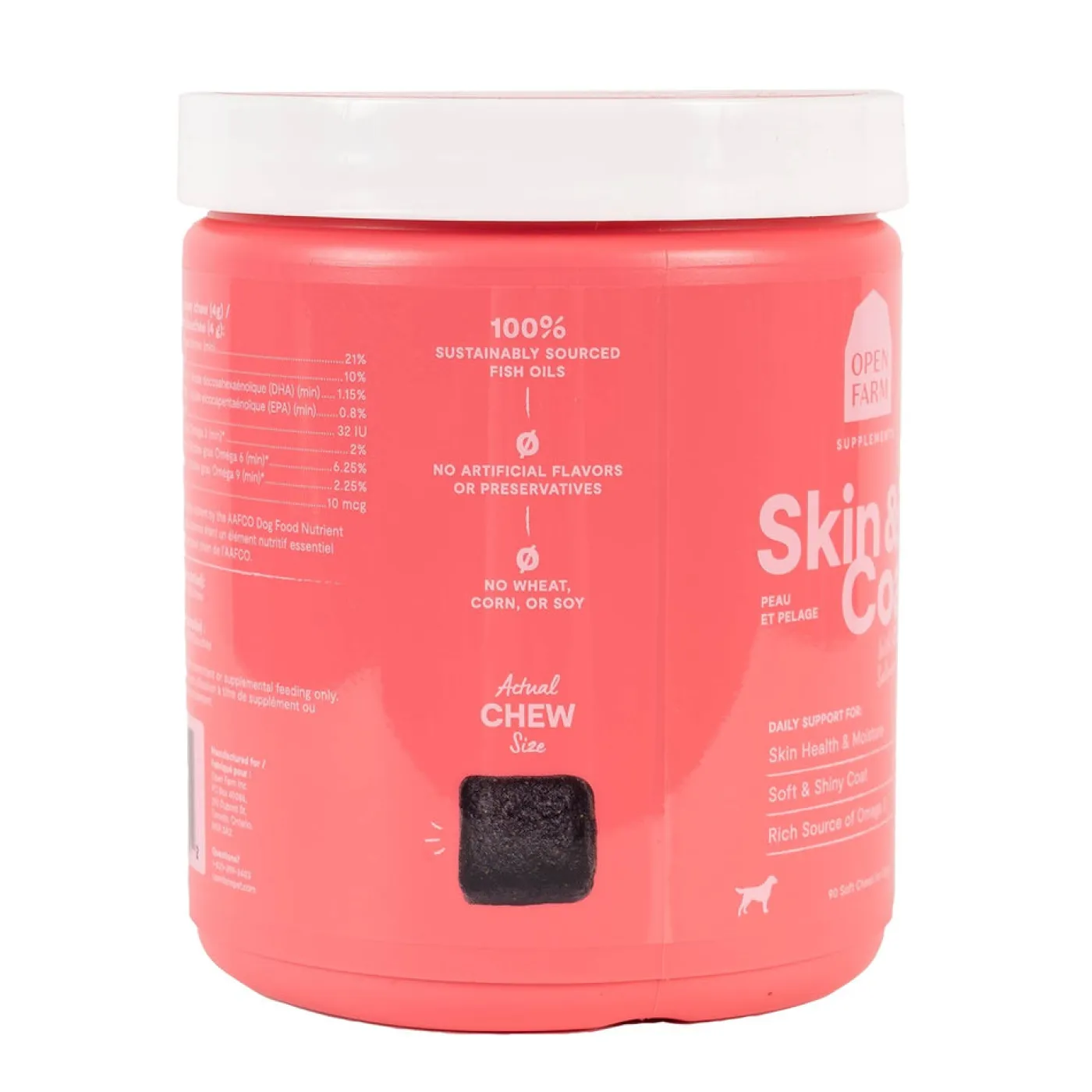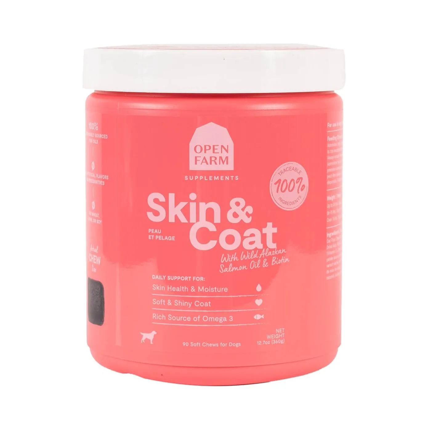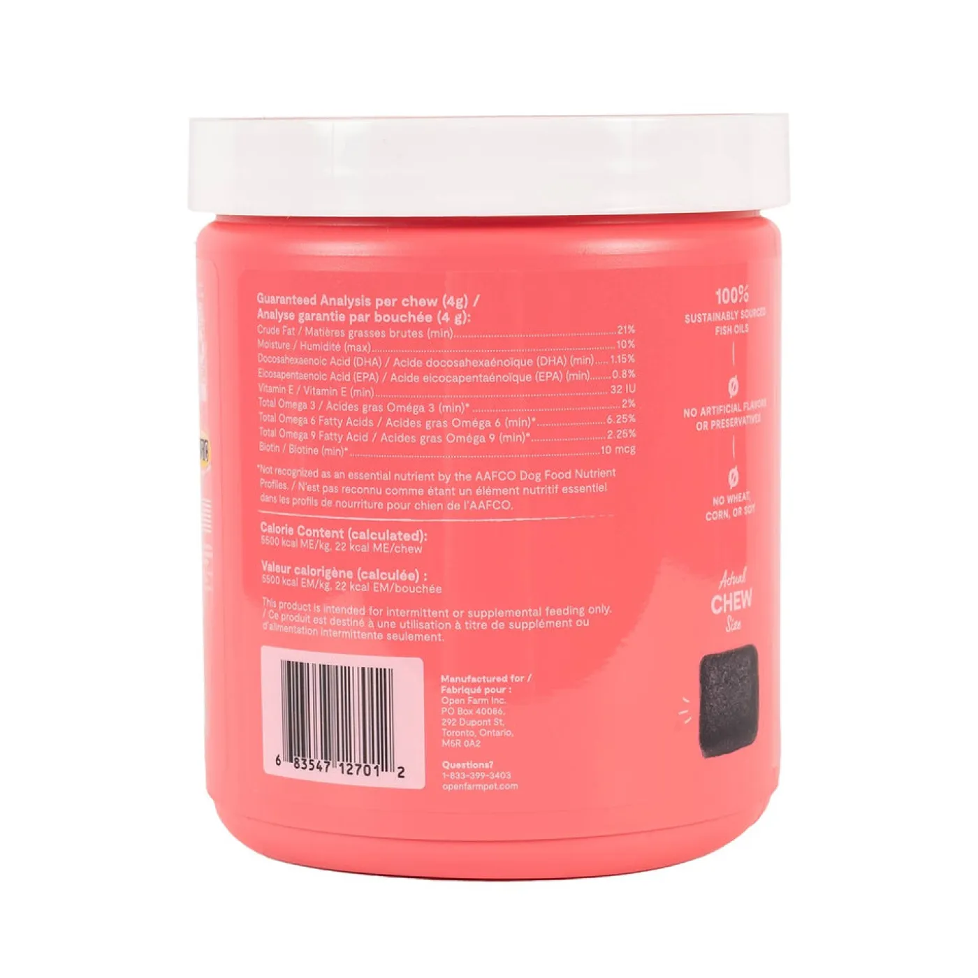 Open Farm Skin & Coat Chews provide support for skin health, and a soft & shiny coat. Formulated with 100% traceable ingredients including MSC certified wild caught salmon. Each package contains 90 oral chews. Packaged in a 100% recyclable resealable jar.