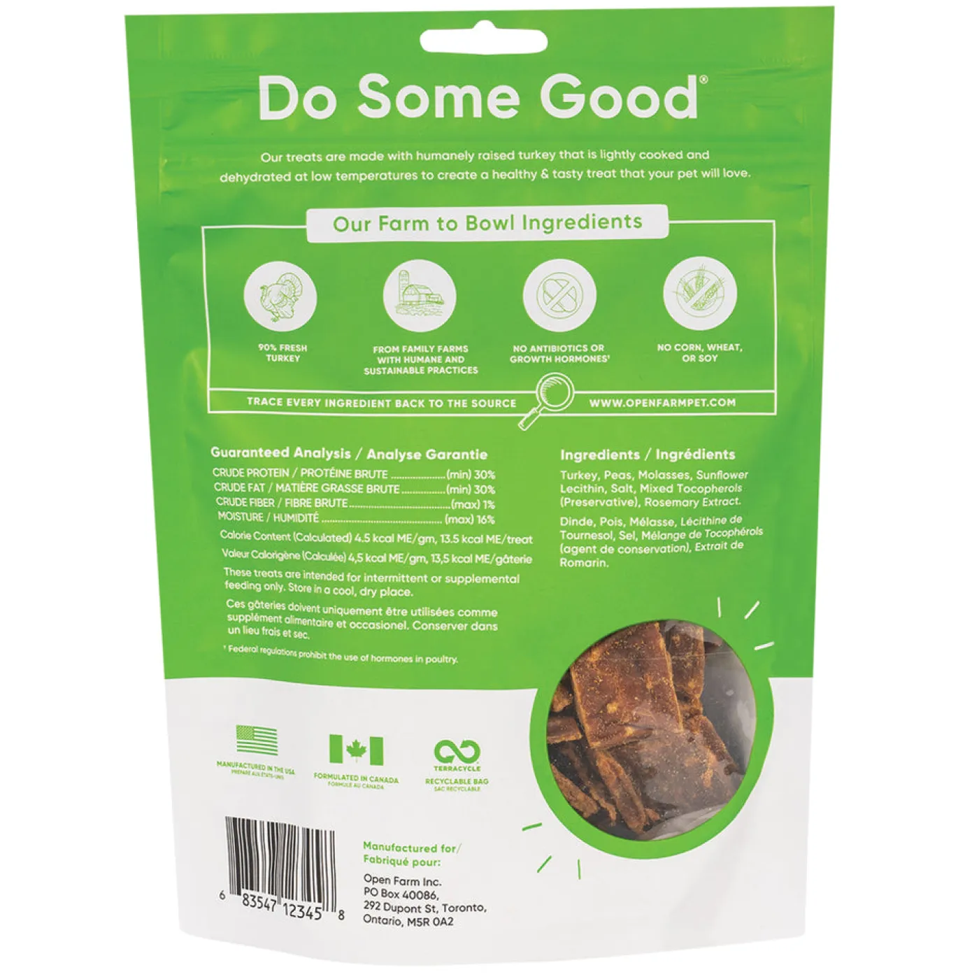 Open Farm Turkey Dog Treats are made from humanely raised turkey that is lightly cooked and dehydrated for delicious flavour. Made from 90% fresh turkey, these low carb treats are perfect for training or for a delicious snack. Open Farm’s ethically raised proteins are sourced from 100% Certified Humane family farms without the use of antibiotics or growth hormones. Contain no glycerin, gluten, grains, corn, soy, artificial colours or preservatives. 100% traceable ingredients.