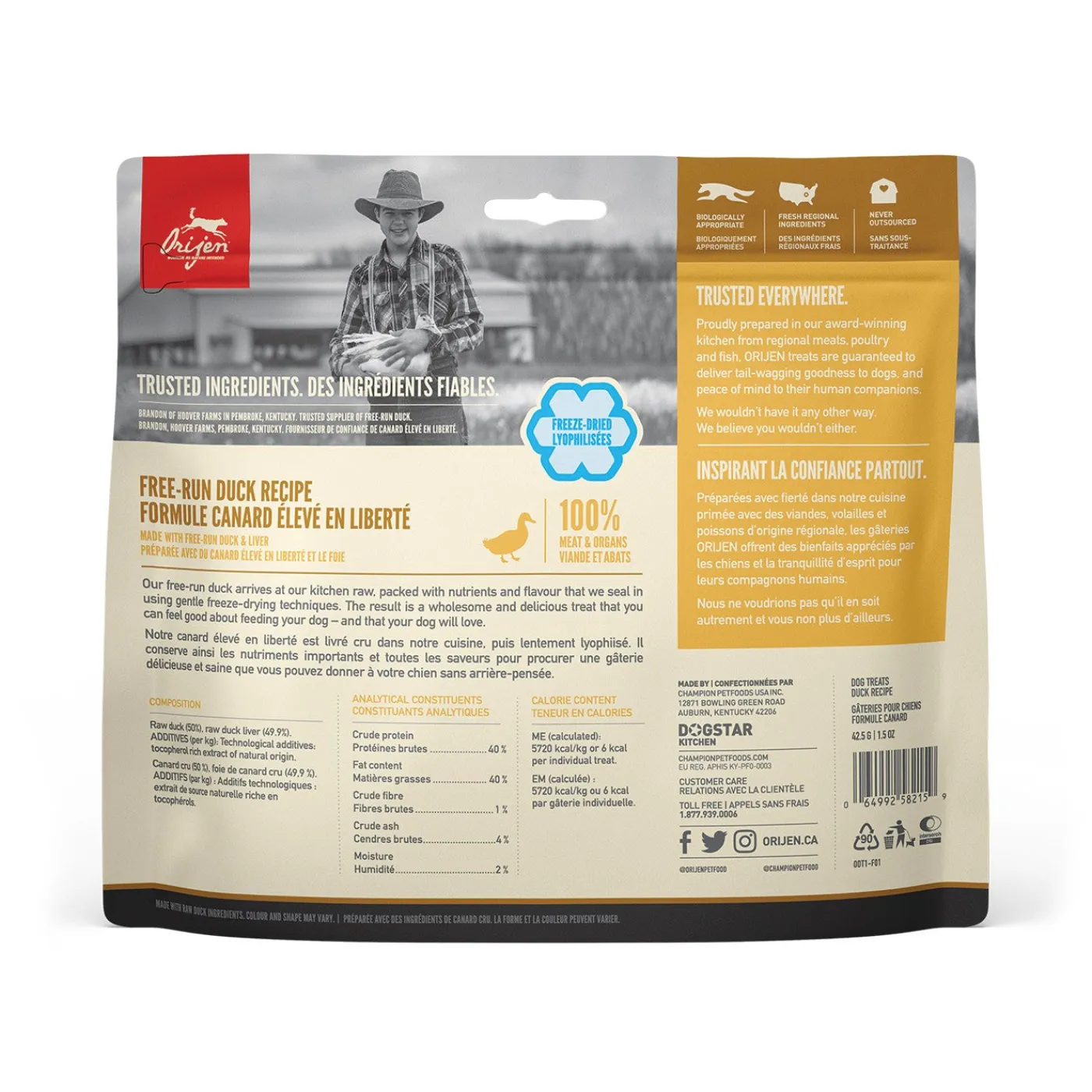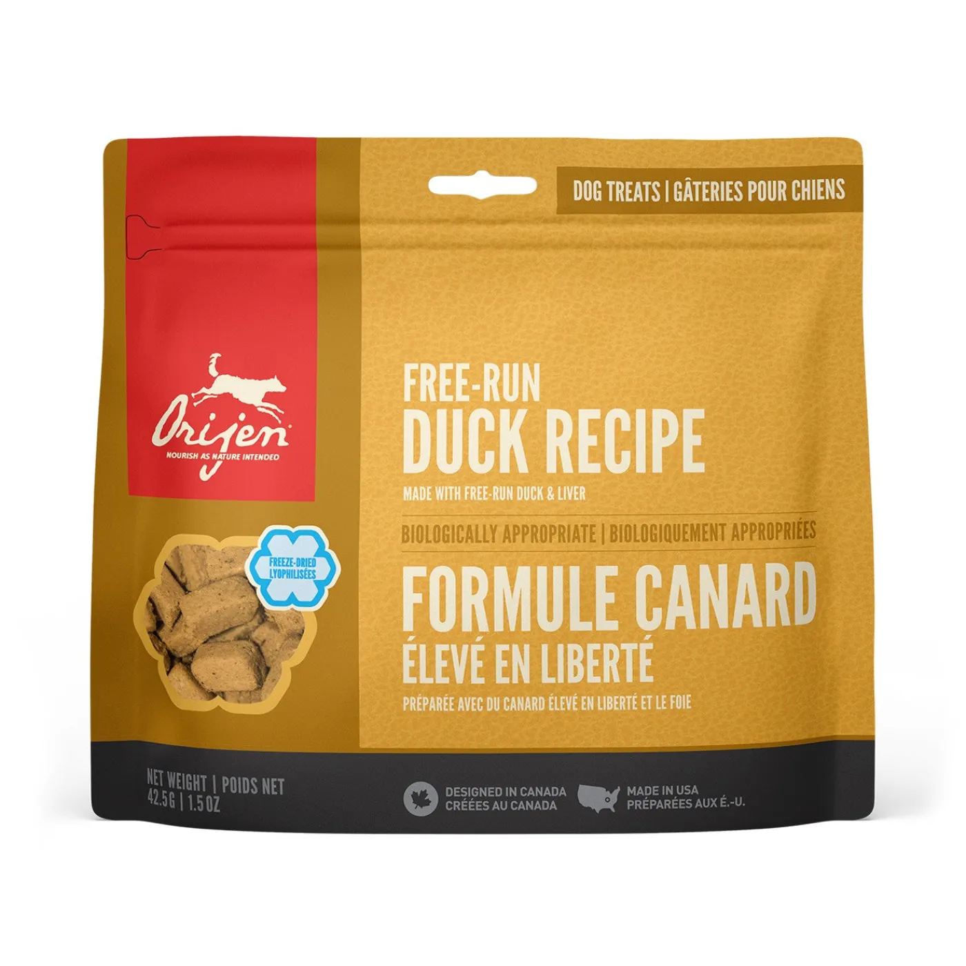 Orijen Freeze Dried Treats are crafted with the same quality ingredients that make up our trusted foods. Our free-run duck is freeze-dried from 100% raw ingredients, locking in nutrients and flavour, for a protein-packed and delicious reward that your dog will love. Made from 100% premium animal ingredients. Suitable for all breeds & life stages.