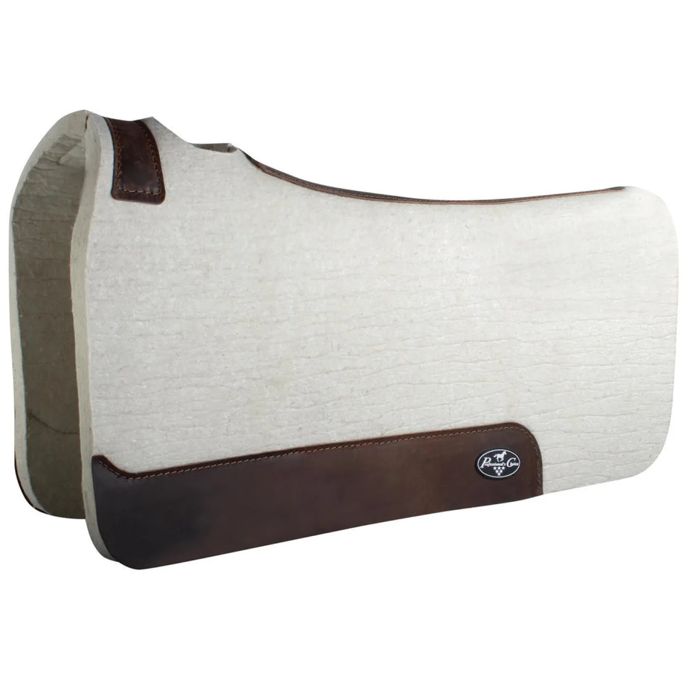 100% steam-pressed felt saddle pad with a channel down the spine to help provide pressure relief and allow for air flow. Cutback at the withers to aid in better freedom of movement and comfort. Contoured design helps provide anatomically correct fit and keeps the saddle in place. 100% genuine leather patches in high-wear areas offer extra durability.