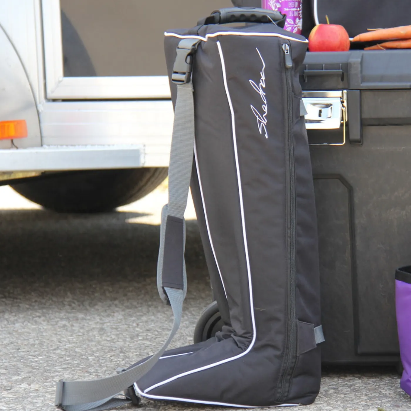 If you are looking for a boot bag that will protect your boots while travelling to the barn or to the show, the Shedrow Boot Bag is a great choice. The Shedrow Boot Bag features separate compartments for each boot with easy to close exterior zippers. The soft quilted interior will ensure your boots are protected from the elements. A convenient top handle and adjustable, removable shoulder strap make this boot bag perfect for use on the go. Finished with plastic bottom feet to protect your boot bag from wear and tear.