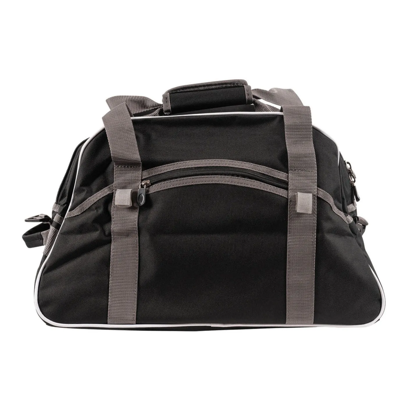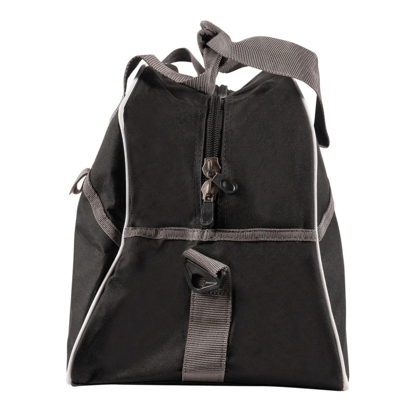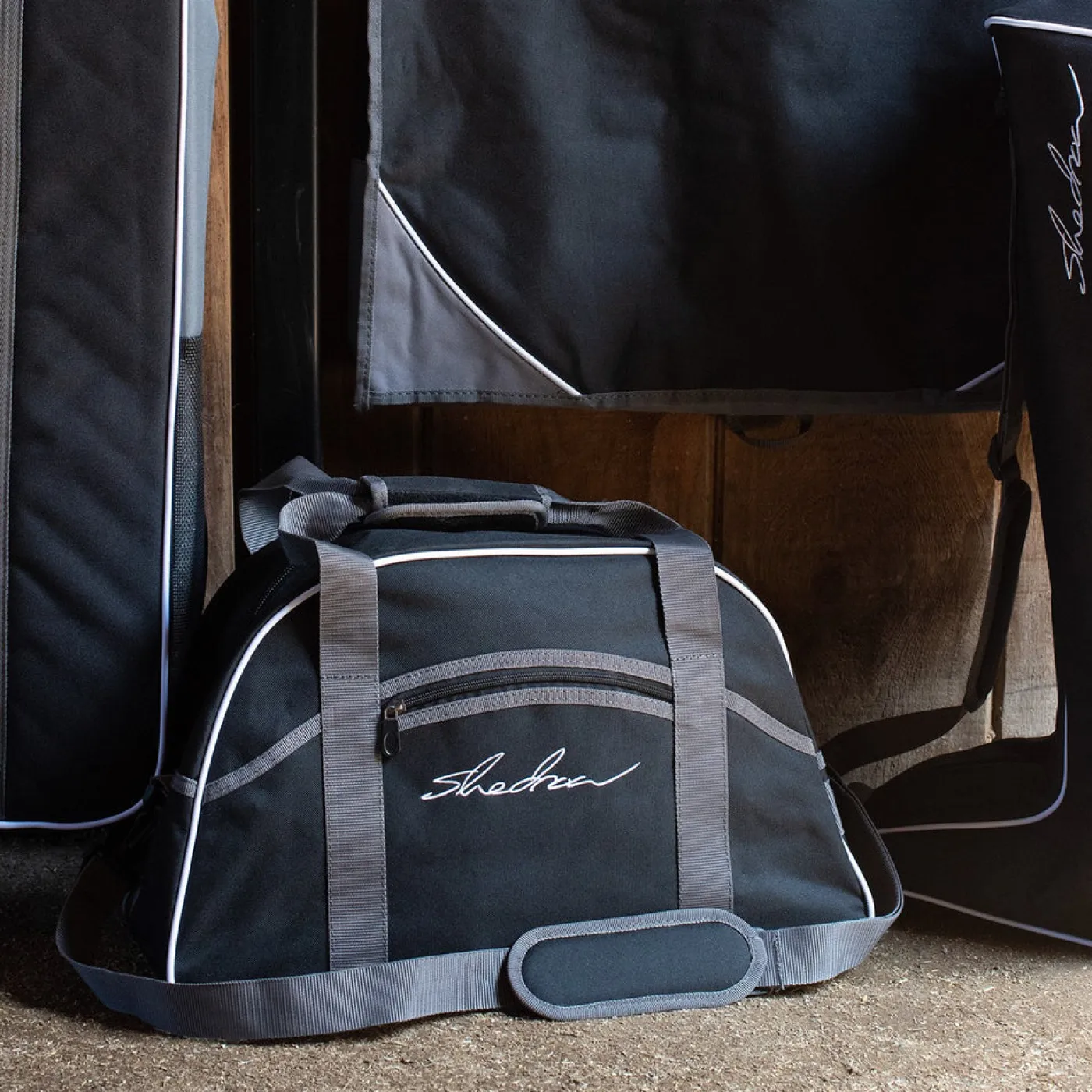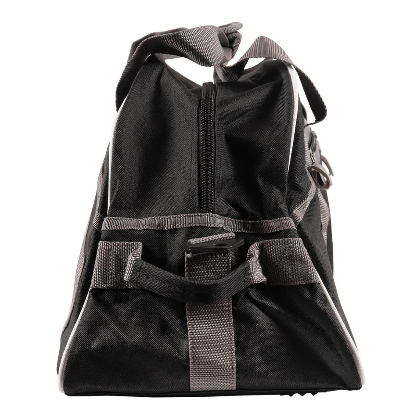 This duffel bag is ideal for both show and barn gear. Use either the adjustable shoulder strap or top handles for carrying. The interior features two nylon mesh pockets and a zipper pouch for easy storage. The bag also includes convenient elastic side pockets. All your items will remain secure with the heavy duty wrap around zipper.