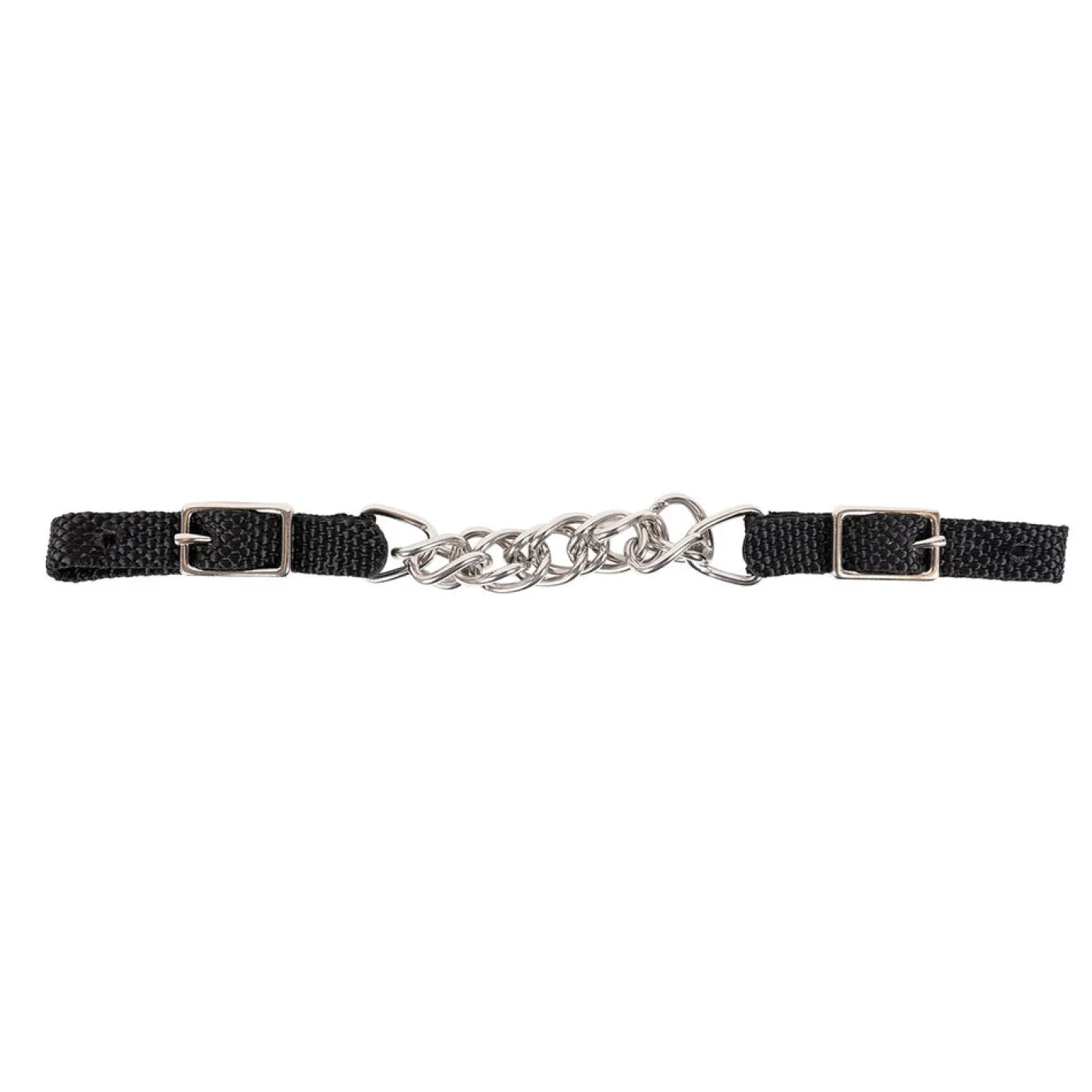 The Shedrow Flat Link Curb Chain features a 11.4 cm flat link chain with nylon end straps. The Curb Chain may be used with a curb bit and runs under the chin to provide added leverage while helping to keep the bit steady in the mouth.
