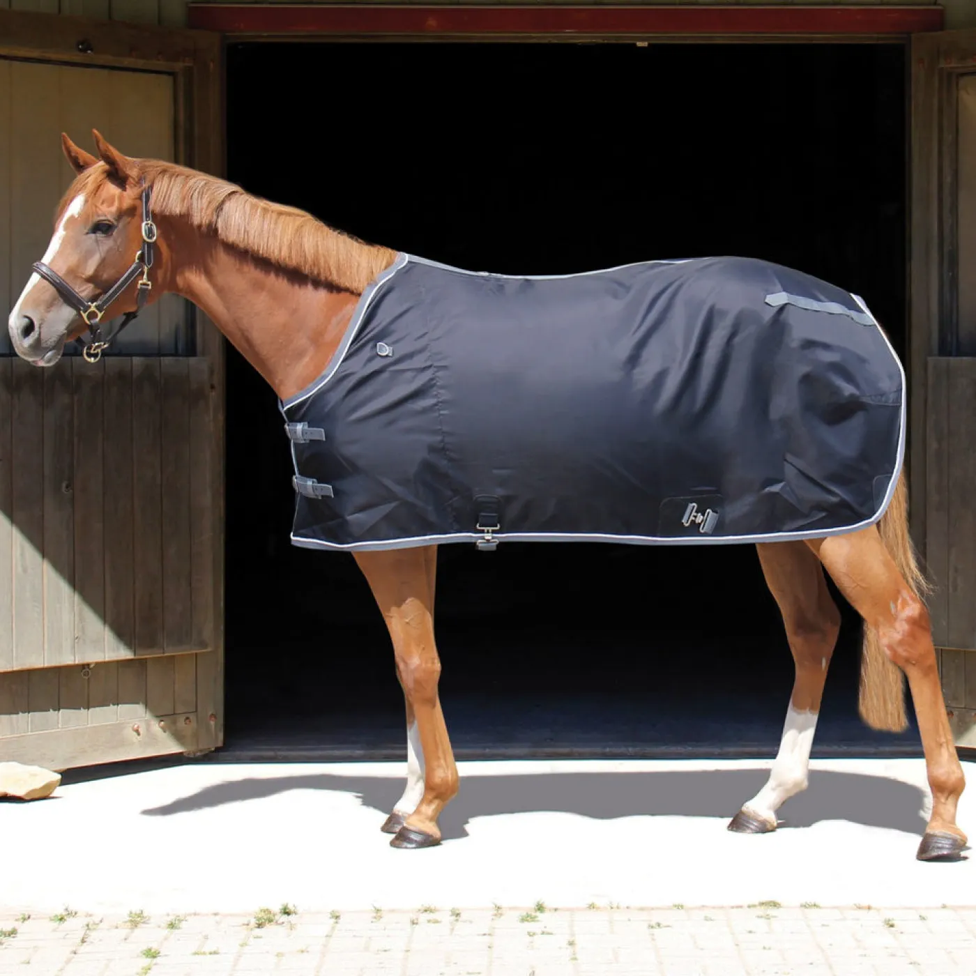 Durable and versatile 420 denier nylon sheet keeps your horse dust-free and even helps polish the coat. Two nylon chest straps with buckles and keepers, a single belly surcingle, and two 5 cm poly leg straps with T-bar closures help keep the sheet in place. Ideal for use after a bath and/or before a show.