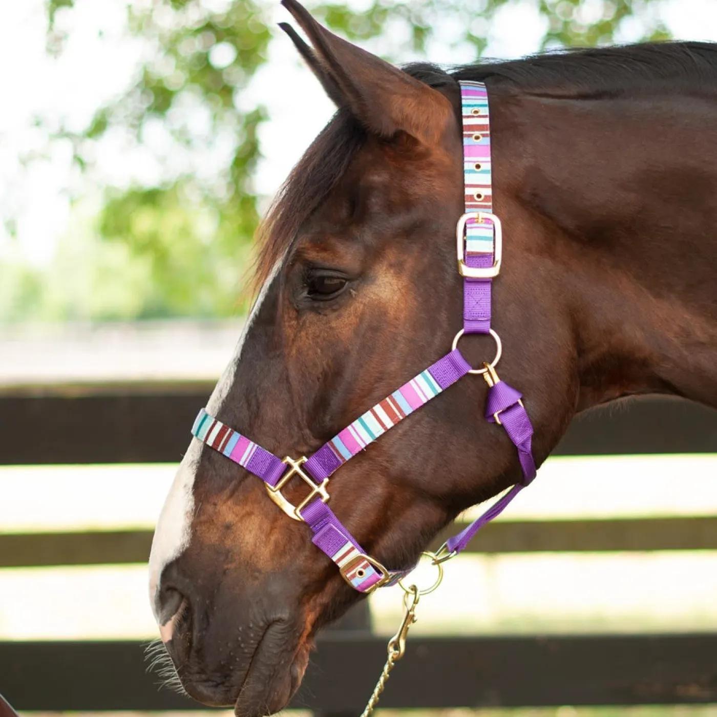 Durable nylon halter detailed with digital printed webbing decoration. Features a neat rolled throat latch and looped on durable brass plated snap for quick and convenient use. Fully adjustable crown and chin strap offer a more customizable fit for your horse.