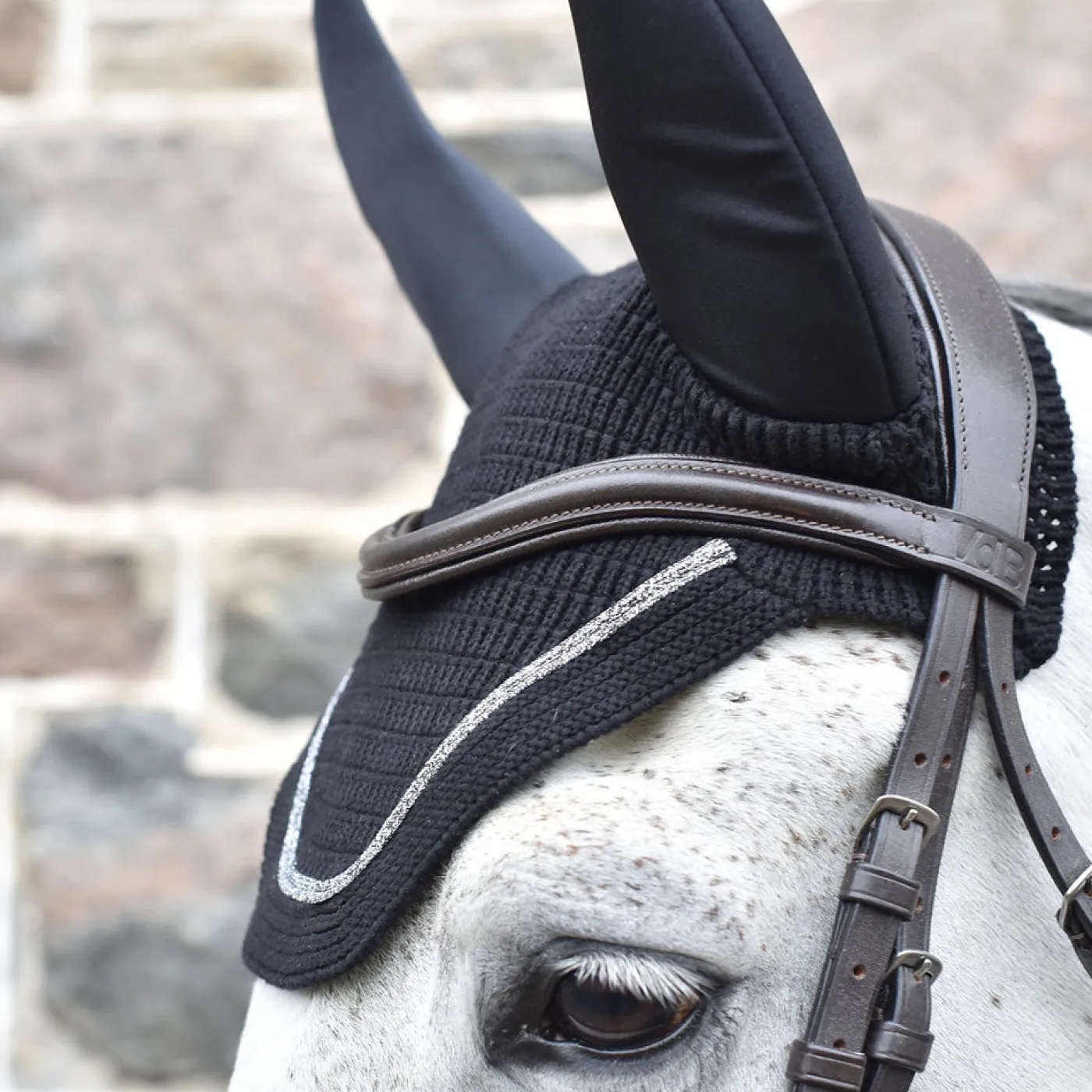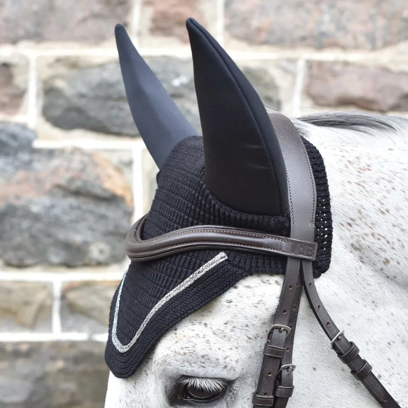 Stylish and durable, the Shedrow Silent Ears Fly Veil is constructed with a crocheted design for maximum breathability. This classic and elegant fly bonnet features soundproof ears and patent leather trim. Perfect for schooling and for the show ring. Ideal for horses who are sound sensitive and won’t tolerate ear plugs. Ears are made from Lycra fabric with 1.5mm neoprene lining.