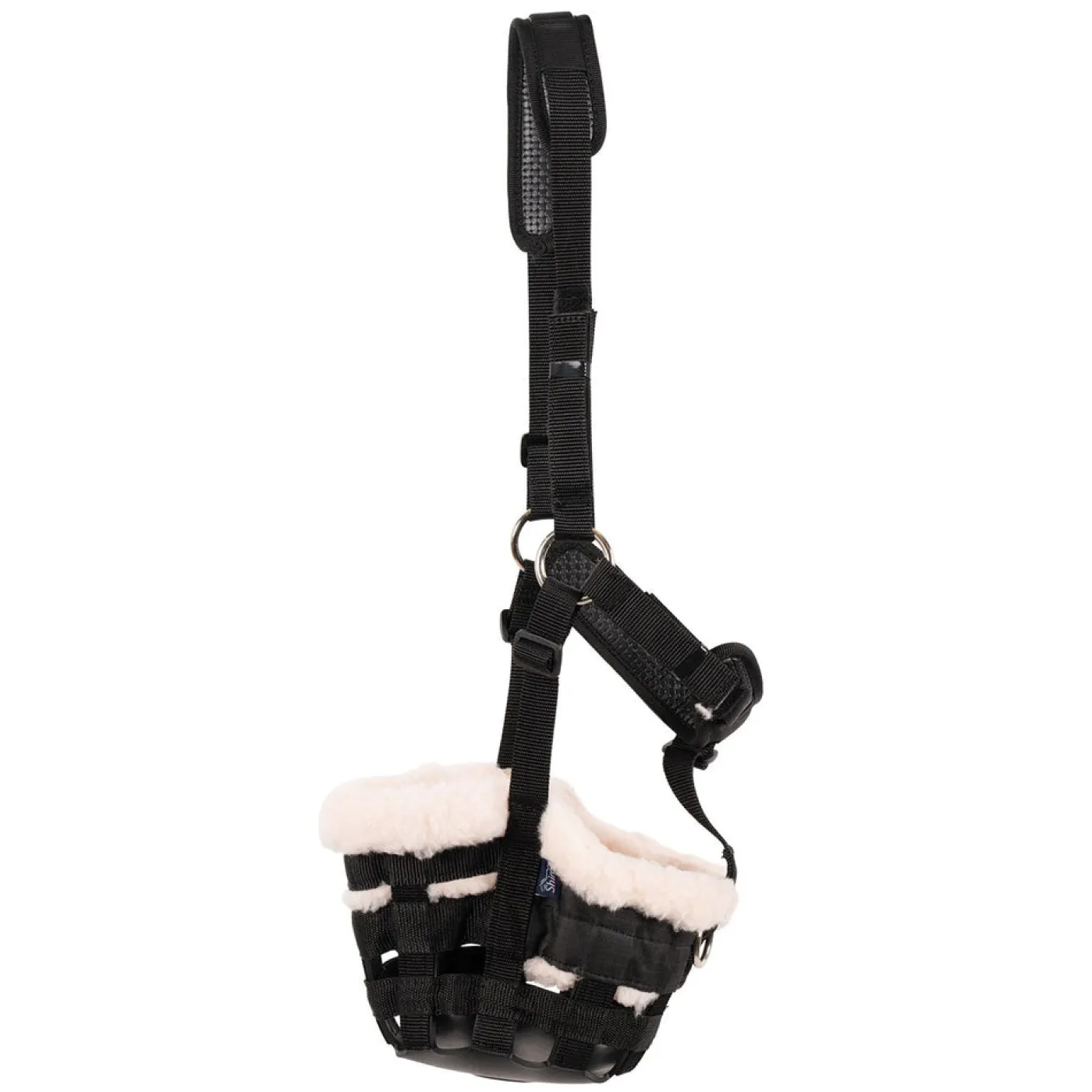 The Shires Deluxe Grass Muzzle features anti-chafe fleece padding for optimal comfort and protection around your horse’s muzzle and chin. Durable rubber muzzle base is constructed with a hole in the bottom for restricted grazing access and reinforced nylon web-bar basket for exceptional breathability. Fully adjustable head and throat straps feature comfort padding and field-safe fastenings. Complete with a D-ring attachment to allow for a lead rope to be attached.