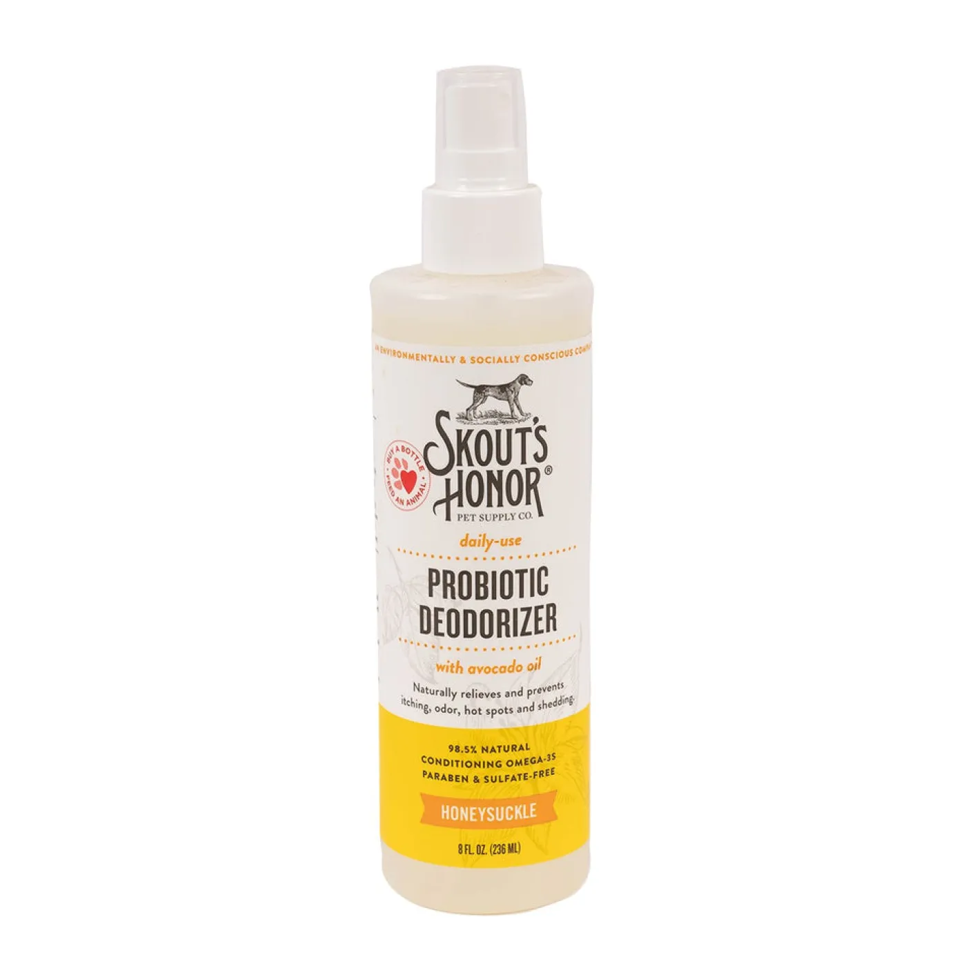 Skout’s Honor Probiotic Deodorizer hydrates and deodorizes the skin and coat for a fresher, better-smelling pet in between washes. Contains avocado oil and topical probiotics that help support a healthy microbiome to defend against common skin problems such as itching, odor, dryness, dandruff, hot spots, yeast and excessive shedding. 236 mL/8 fl. oz.