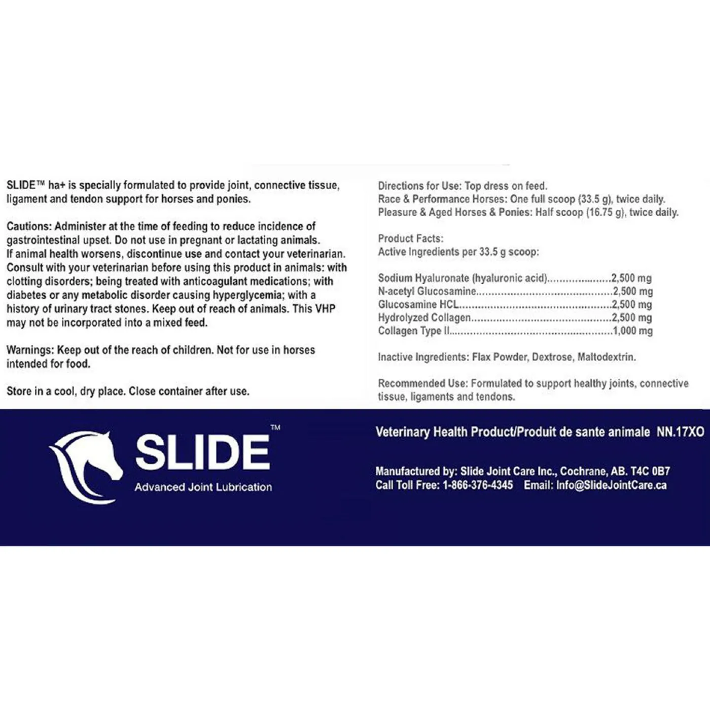 Slide HA+ is an oral equine supplement formulated to support healthy joints, connective tissue, ligaments and tendons. Powder.