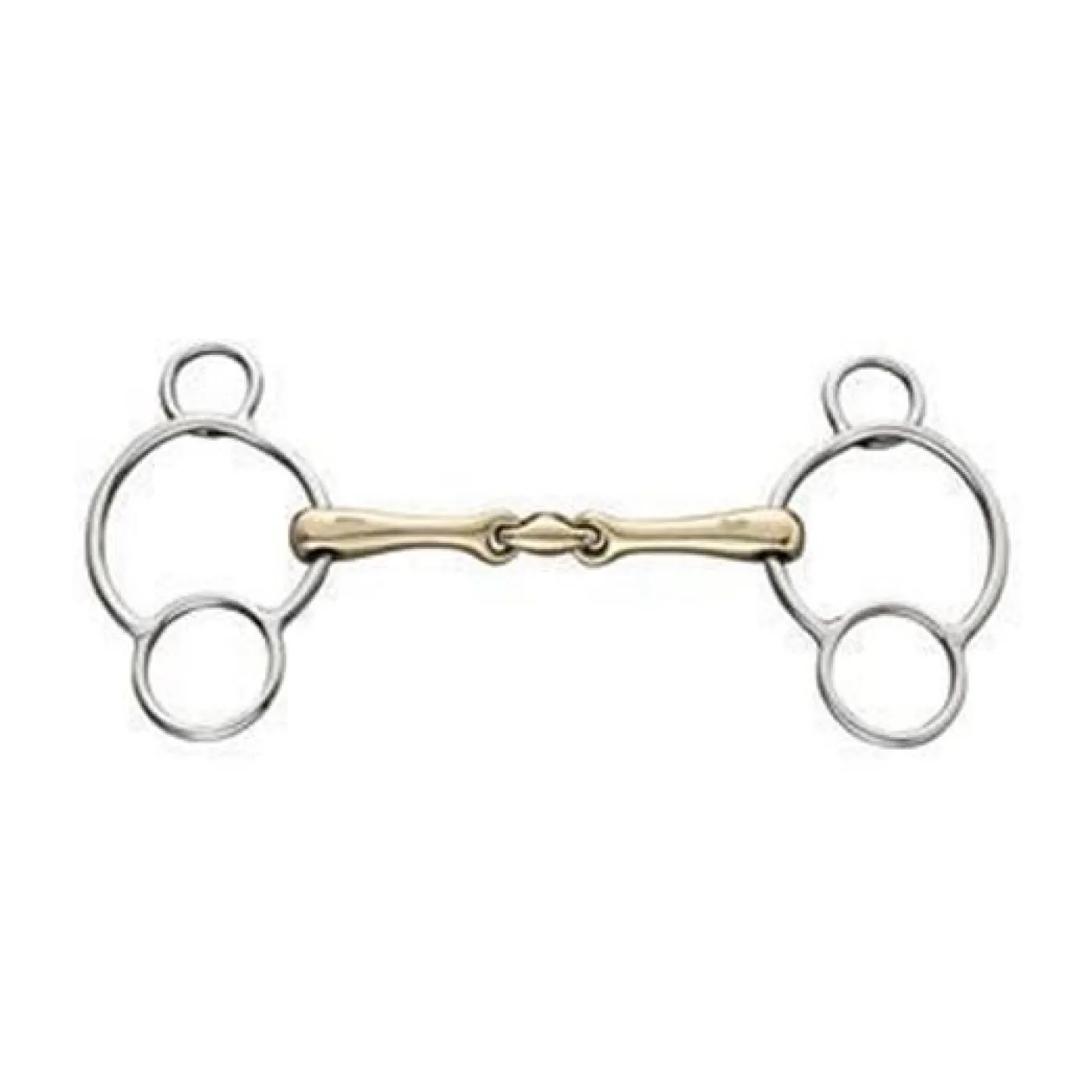 The innovative design of the KK Ultra Universal Double Jointed Snaffle offers versatility for rein placement. Secure, fixed attachment to the bridle helps to better distribute poll pressure and maintain the correct placement of the bit in the horse’s mouth to ensure consistent and comfortable contact. The slightly lateral offset position of the upper ring slightly delays the indirect lever action when rein placement is at the lower ring. This ergonomic design is slightly softer than traditional three-ring style bits while still allowing the rider to have more control when needed. The unique link is shorter than most double jointed links, and is rotated 45° to the front to adapt to your horses oral anatomy. Crafted from Sprenger’s Sensogan ® metal alloy, this bit has a low copper content that increases salivation while remaining easy to clean and shine.