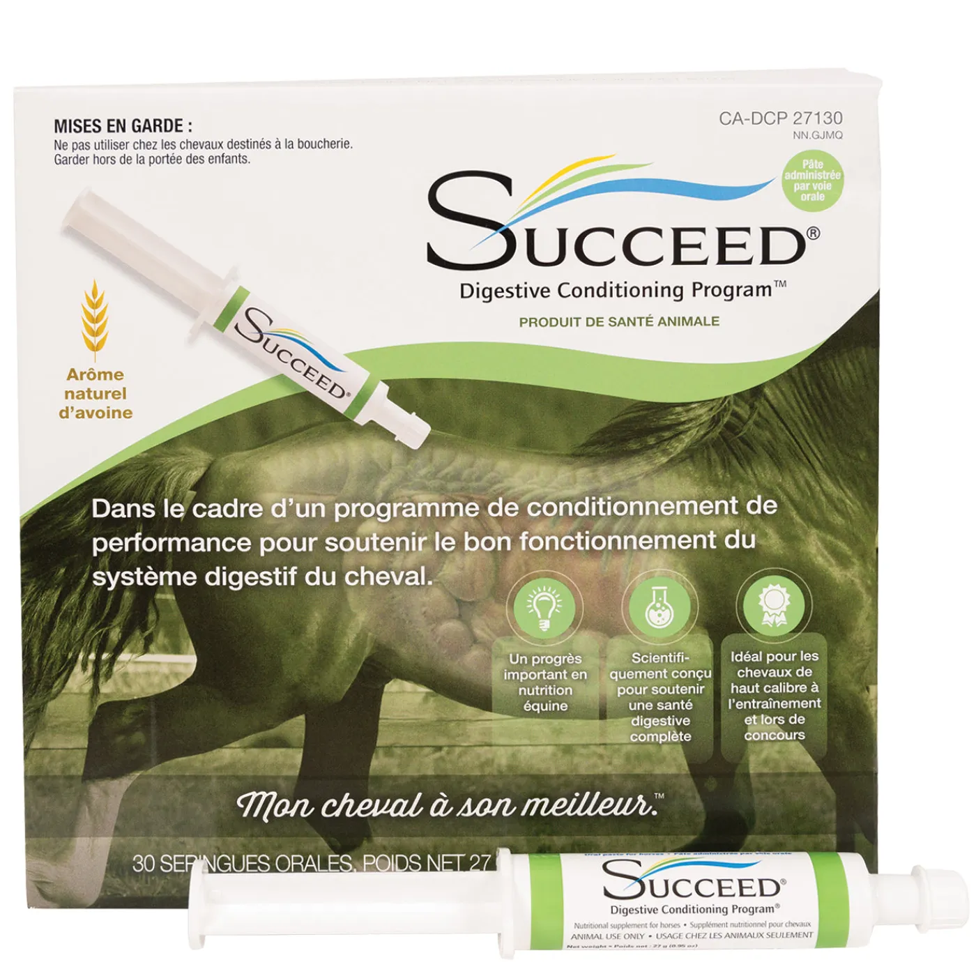 Succeed’s Digestive Conditioning Program is an oral equine supplement that can help support a healthy equine digestive tract. It contains natural ingredients including oat oil, oat flour, yeast products, L-glutamine and L-threonine. The paste formulation is a great choice for picky eaters. Each carton contains (x 30) 27 g oral syringes.