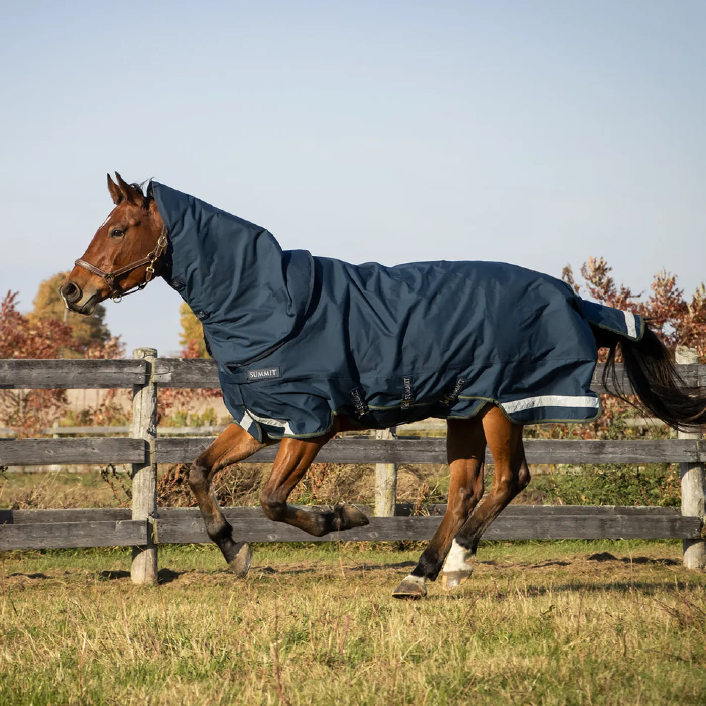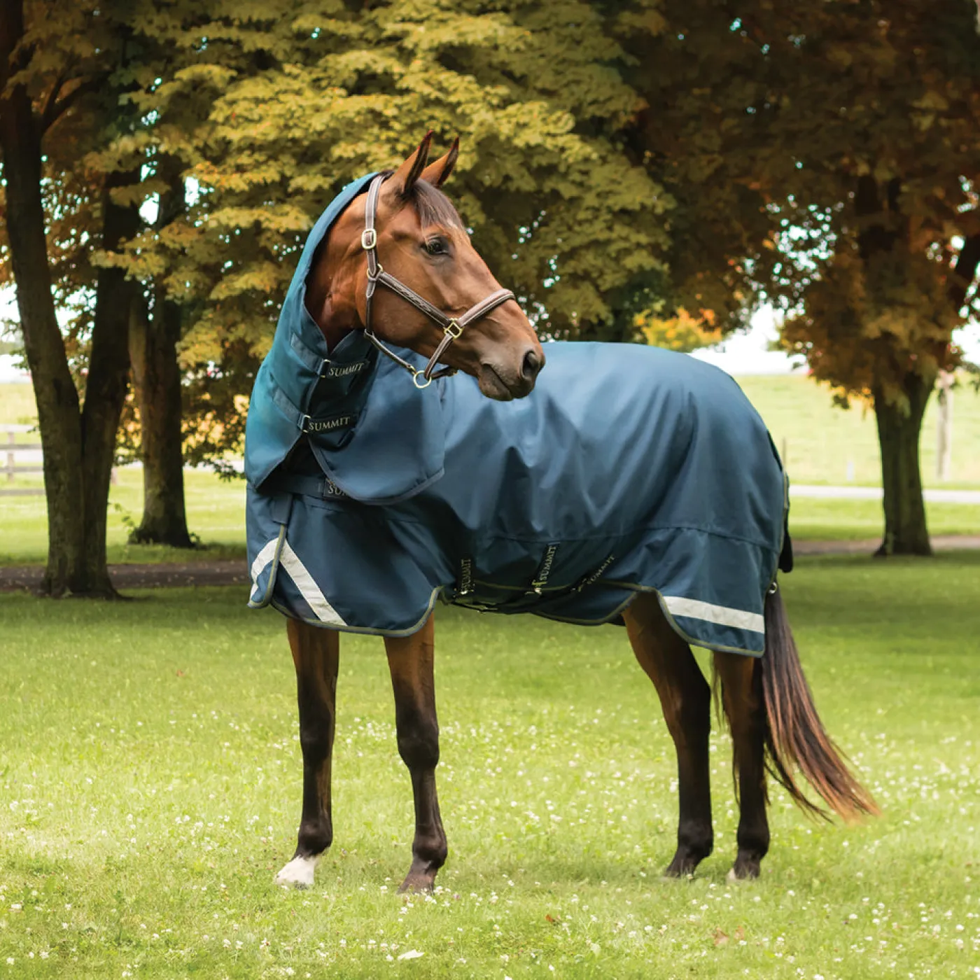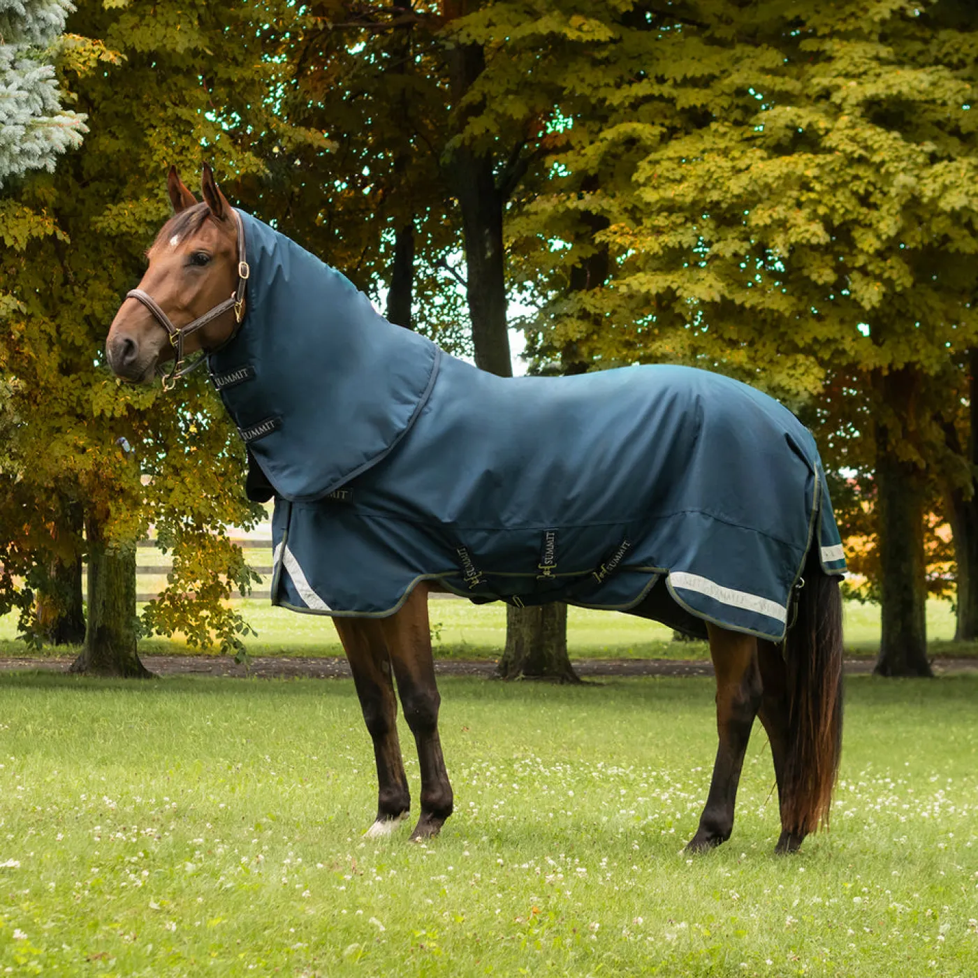 The Summit Nova Turnout offers protection to your horse during unfavourable weather. Made from 1050D Cordura ballistic nylon to withstand the elements. Features a 3 surcingle belly closure to keep blanket in place and internal wither padding to prevent rubs. Complete with a wipe-clean tail cord, and gun-metal hardware. Sold with a hood for added coverage.