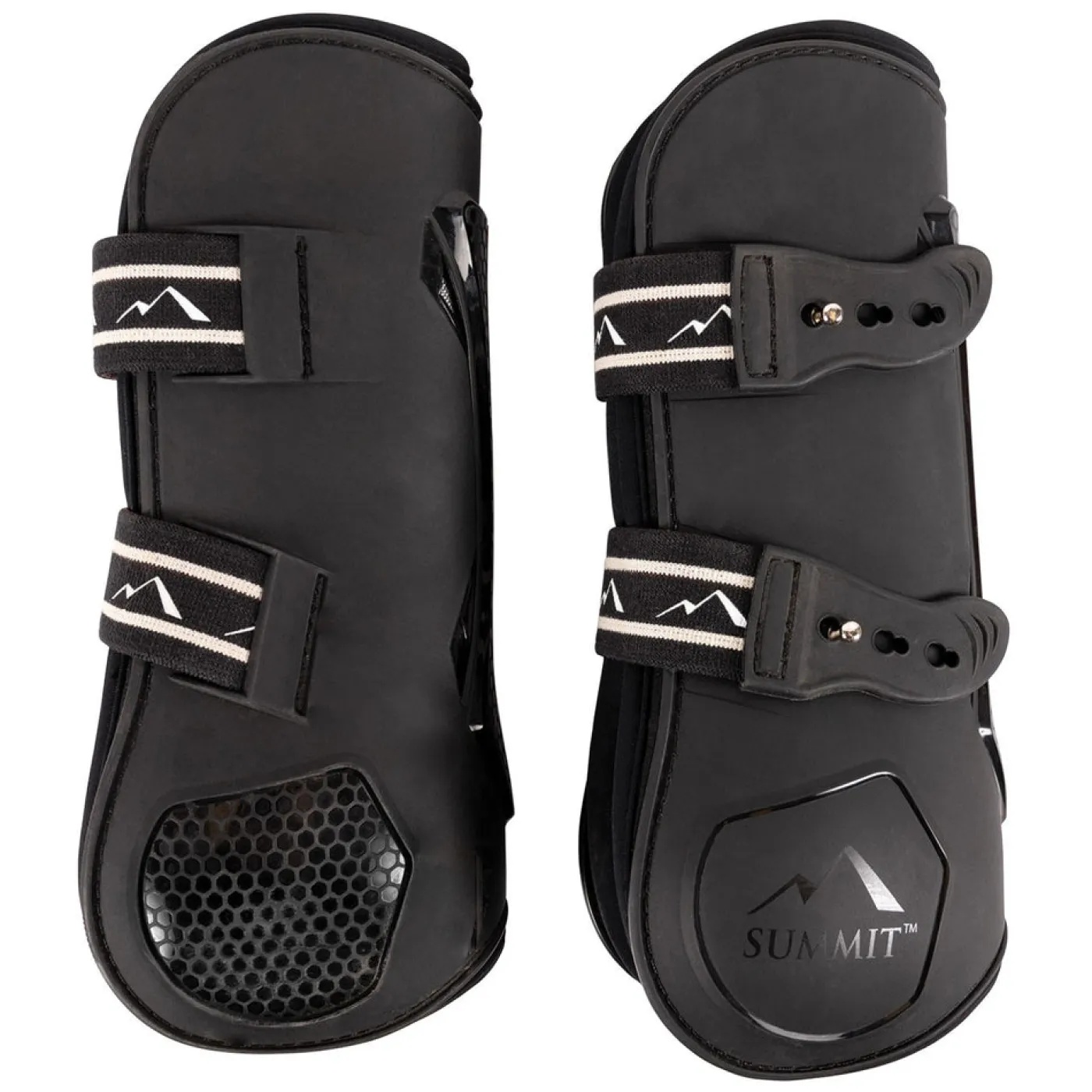 The Summit Open Front Tendon Boot offers an elegant construction with an anatomic shape, and superior functionality, suitable for everyday schooling or in the show ring. Features a double ventilation system to help channel heat away from the horse’s leg. Complete with elastic hook and tab closures for easy on and off.