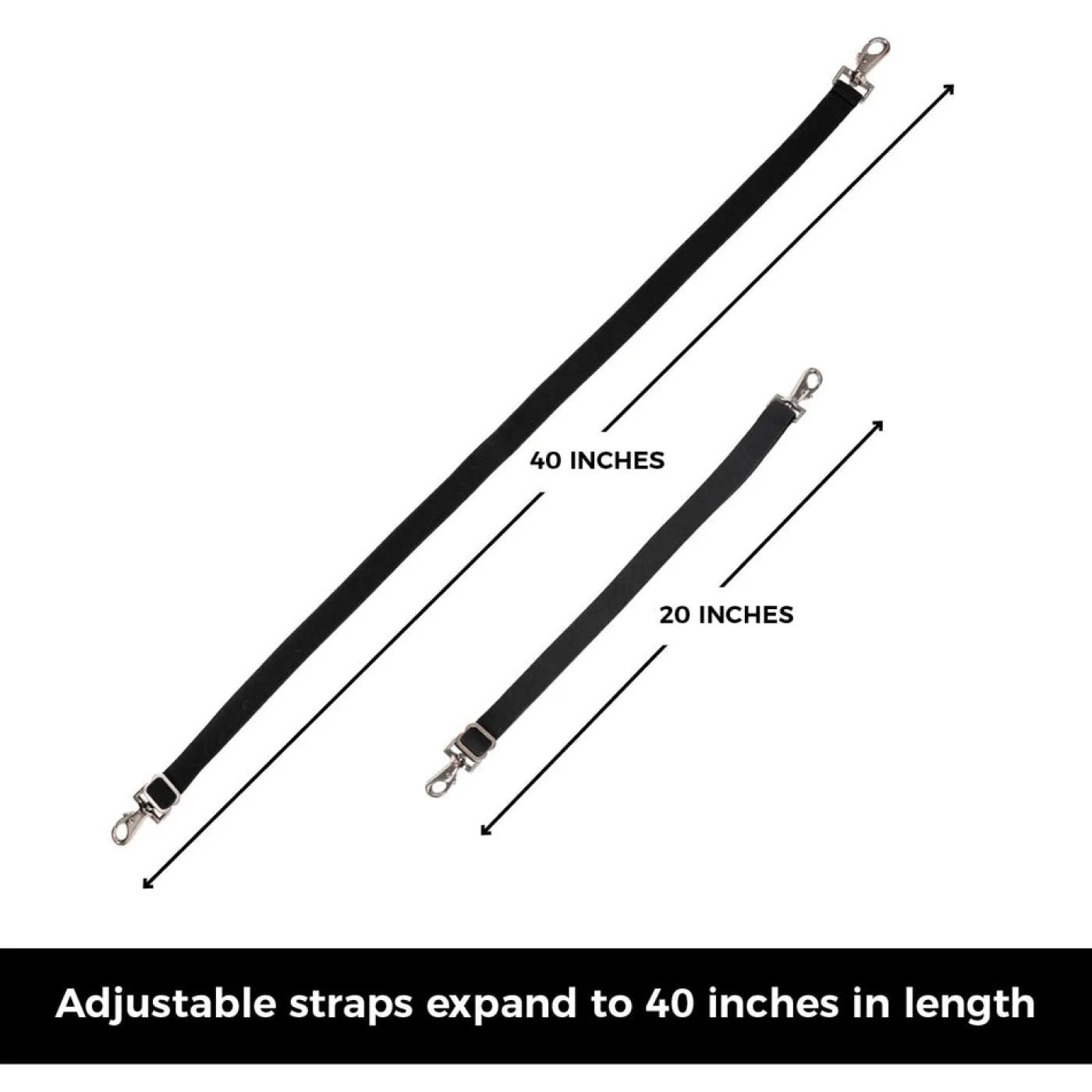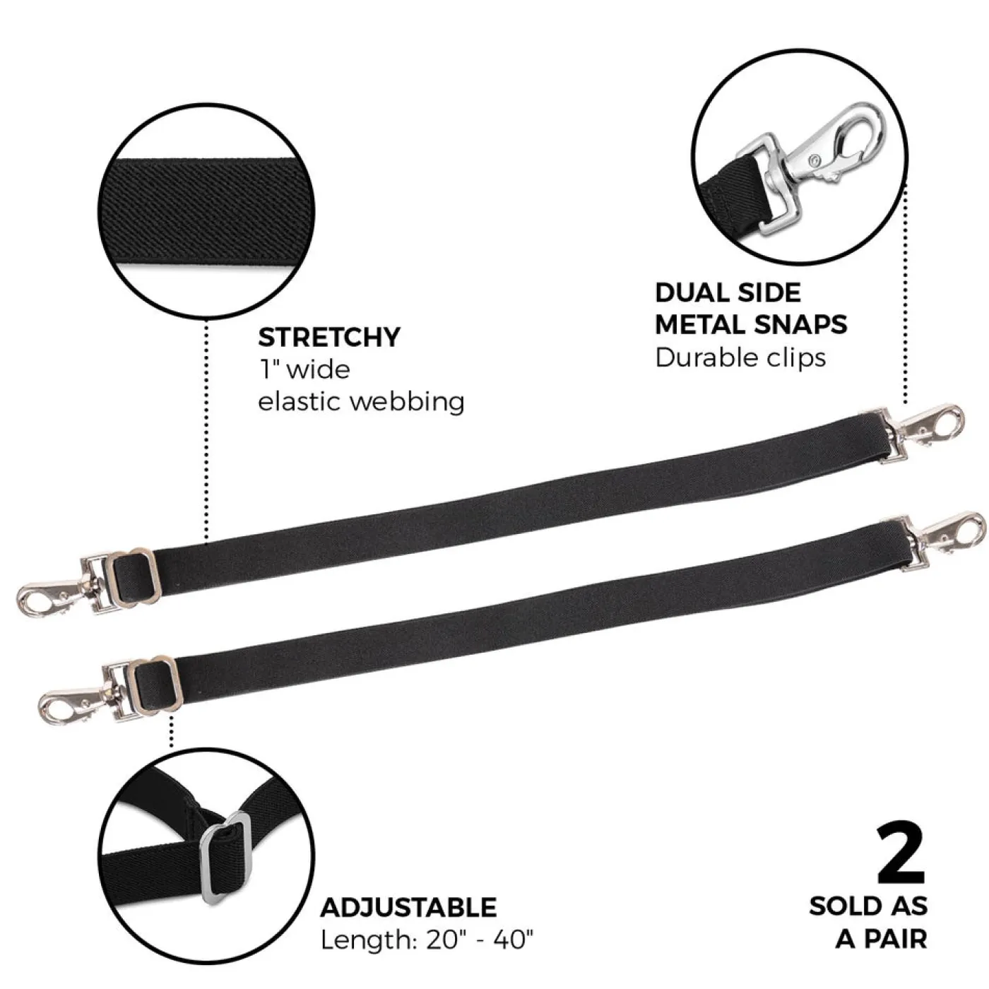 Stretchy, adjustable nylon straps with silver clips on either end attach to D-rings at the back of any blanket. Adds stability to a blanket lacking leg straps, or replace ones that are old or missing. Sold as a pair.