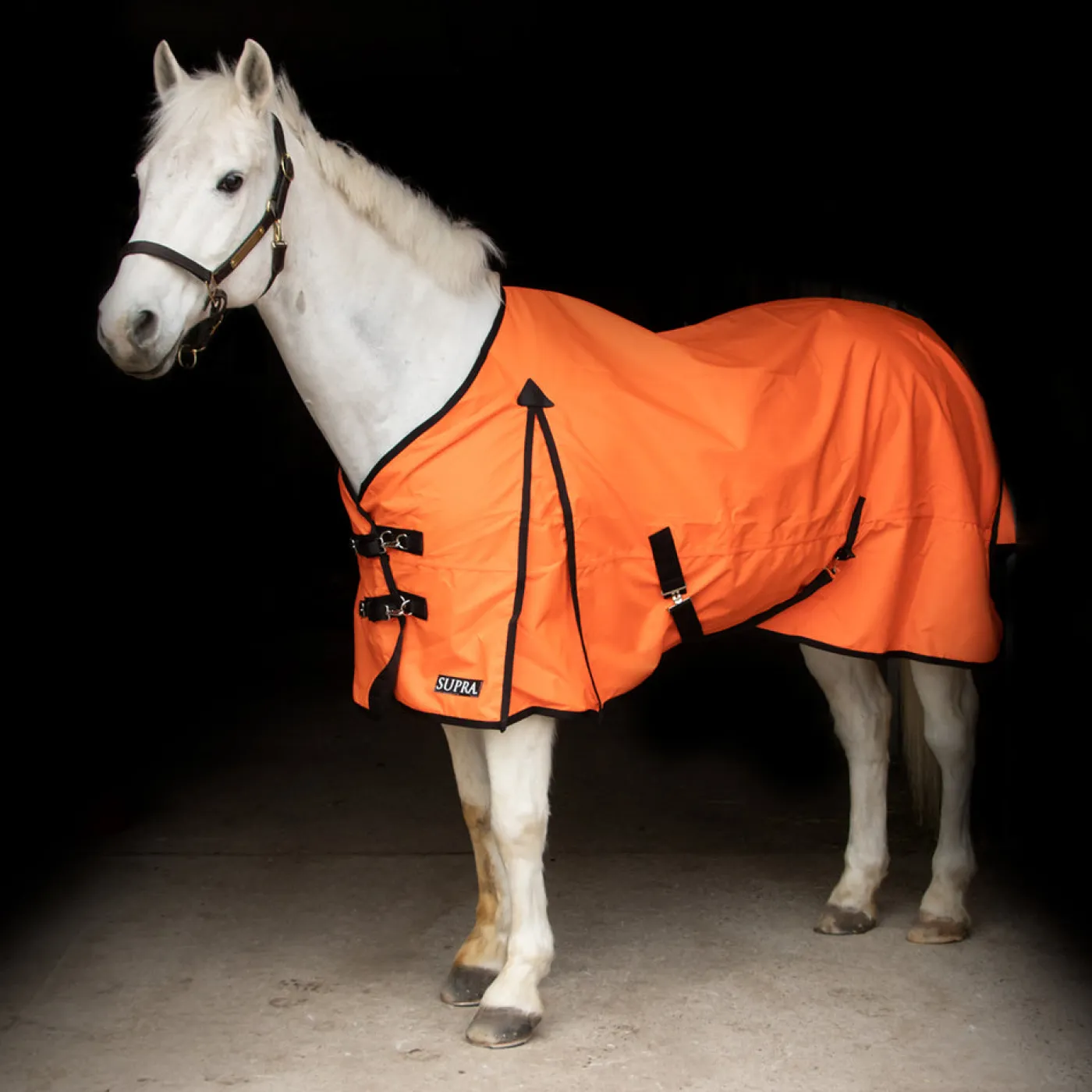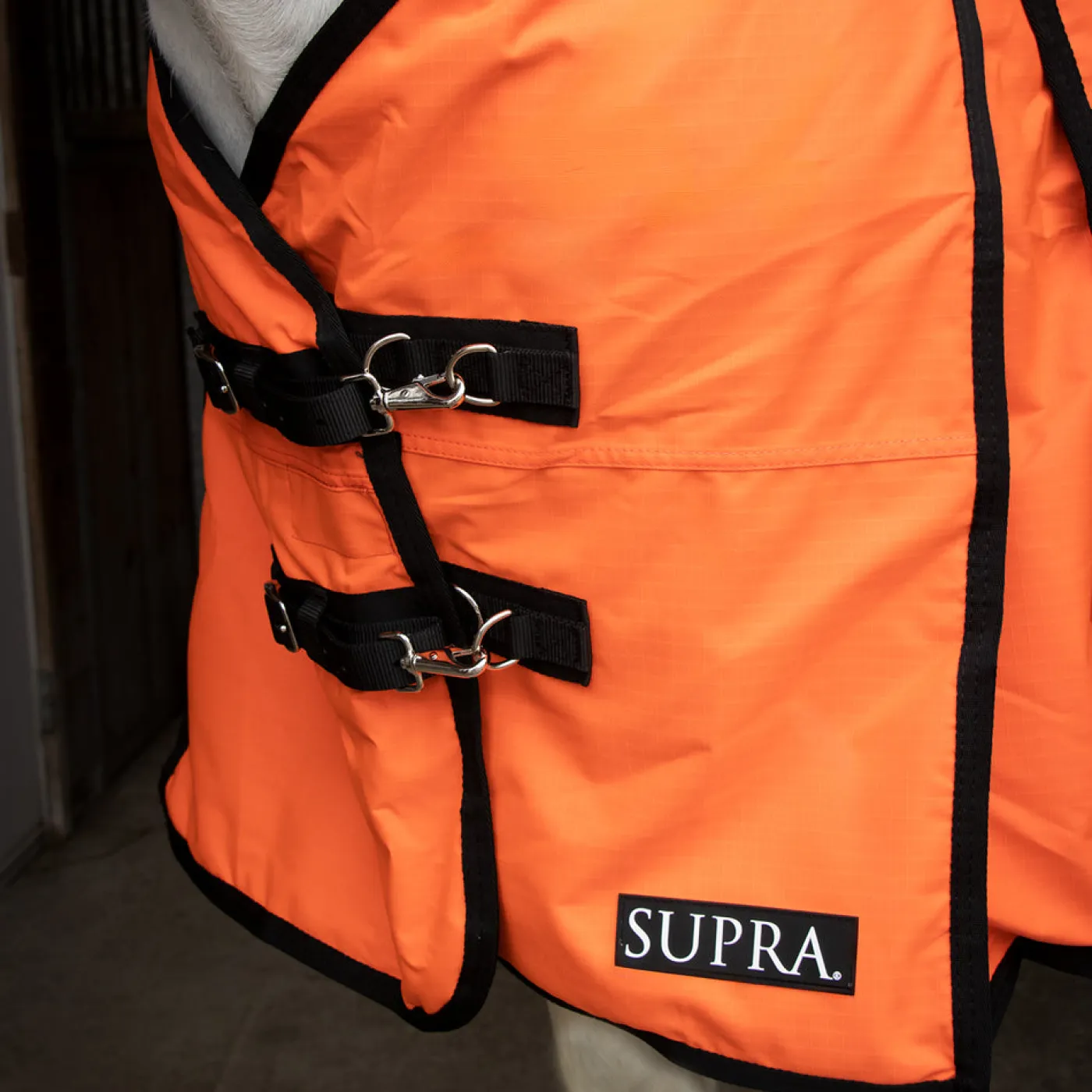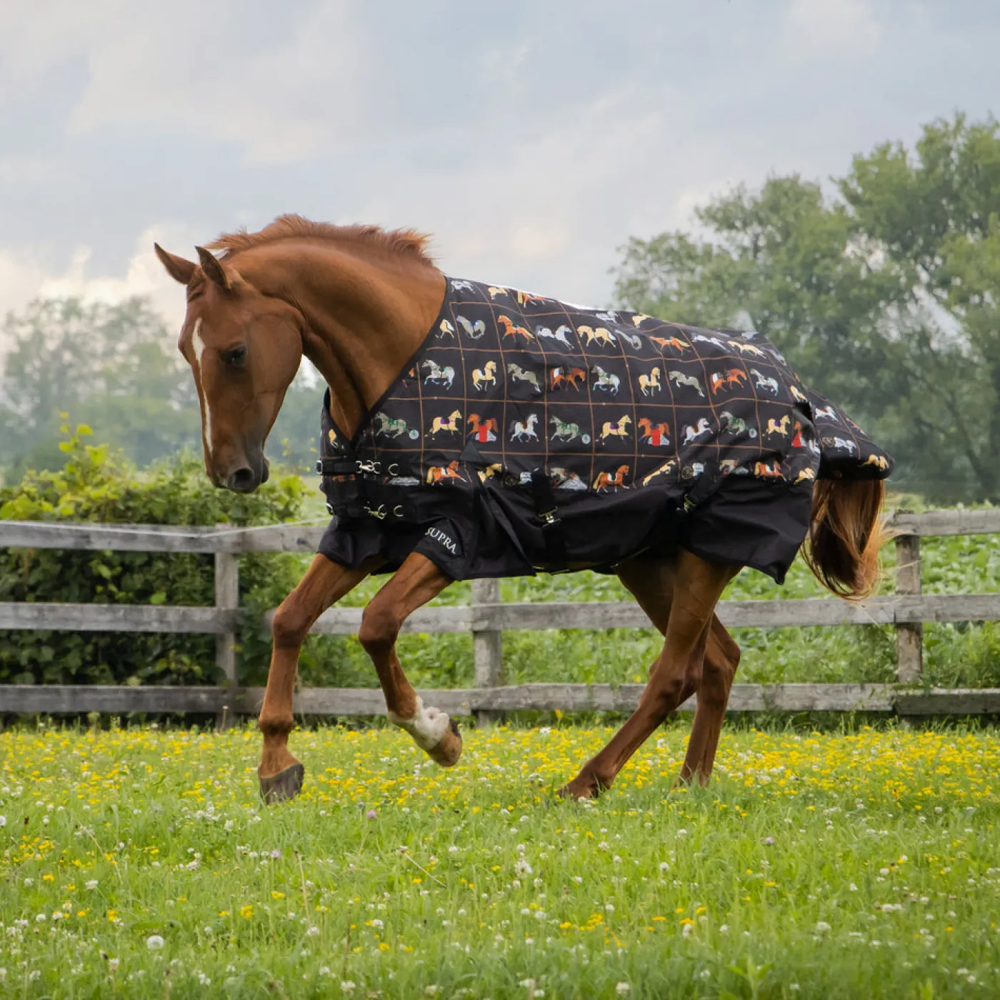 The Supra Rainsheet offers best-in-class protection against the elements! Features a waterproof and breathable construction with no back seams. Made with a 210 denier nylon lining and 600 denier exterior to help keep your horse comfortable and dry. Complete with cross-biased surcingles, double front buckle closures, and adjustable leg straps.