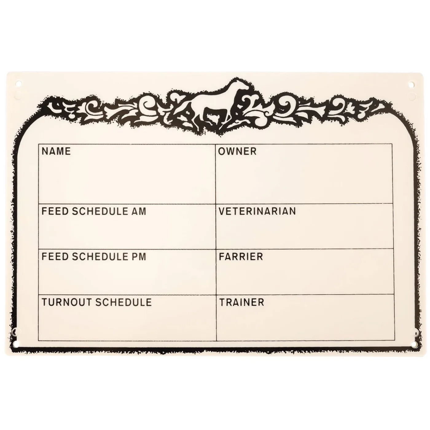 The Supra Stall Plate is the perfect solution to ensure horses receive individualized care. Call out important information about your horse with this plastic stall sign. Includes fields for your horse’s name, owner information, AM and PM feeding details, turnout schedule, veterinarian, trainer and farrier information. This reusable stall sign is compatible with dry erase markers and easily wipes clean when information changes. Includes predrilled holes for easy installation. Mounting hardware not included.