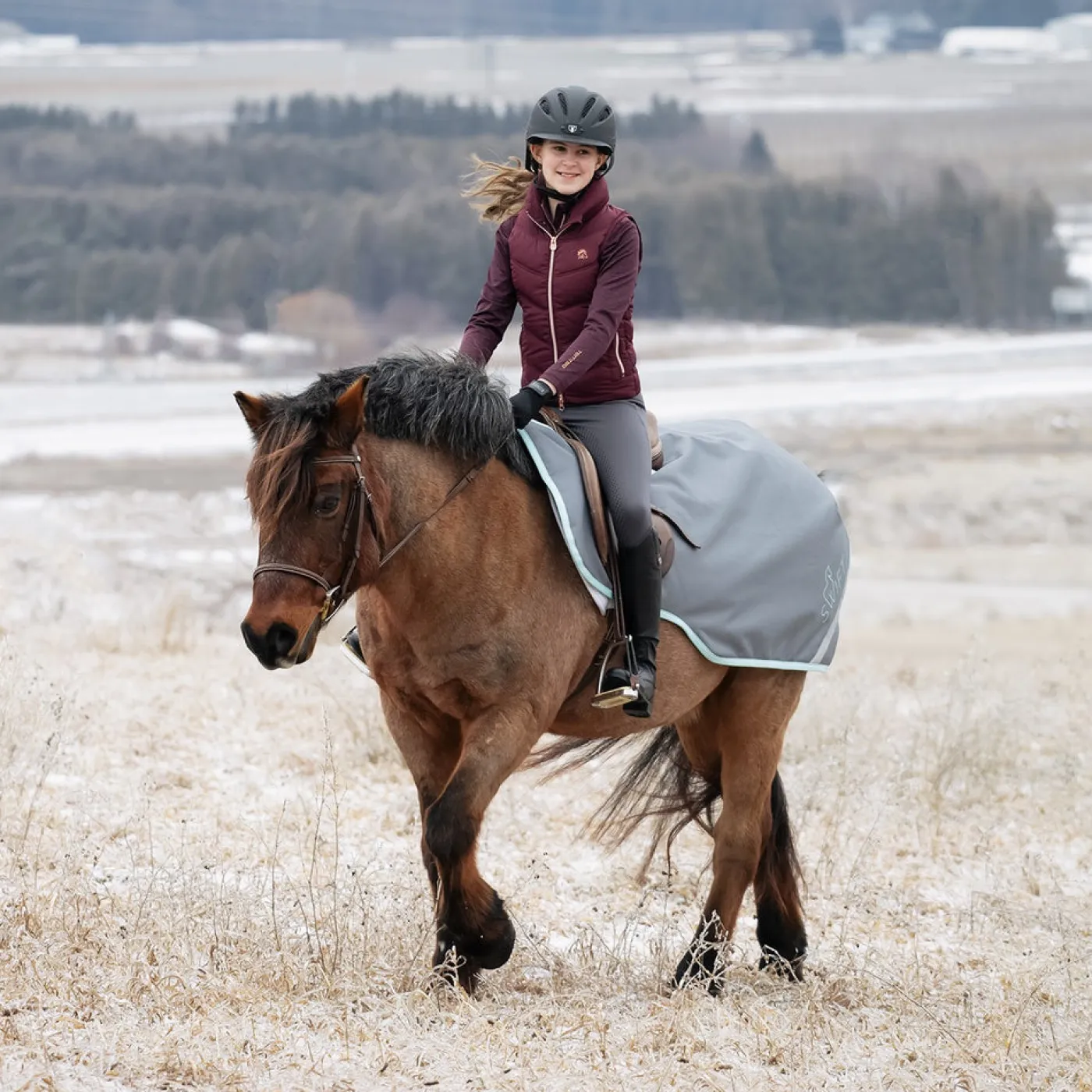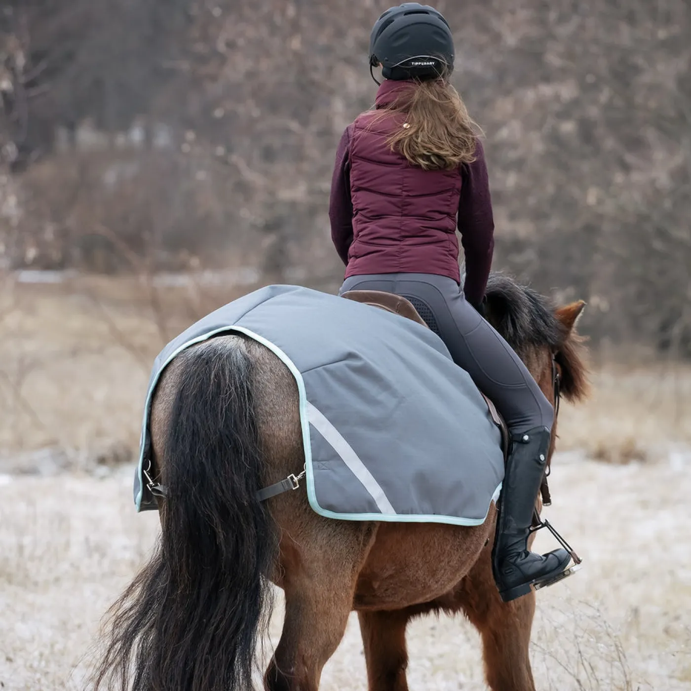 Perfect for those chilly days, the Swift Exercise Sheet will help keep your pony warm. Features our 1200D Swift turnout material with our mint trim, two sided reflective stripe and 150 g fill. This exercise sheet features a saddle cut-out and a strong Velcro closure for easy removal while in the saddle. Contoured sides allow your leg to maintain contact with the horse. Finished with a tail strap for a secure fit. Waterproof & breathable.