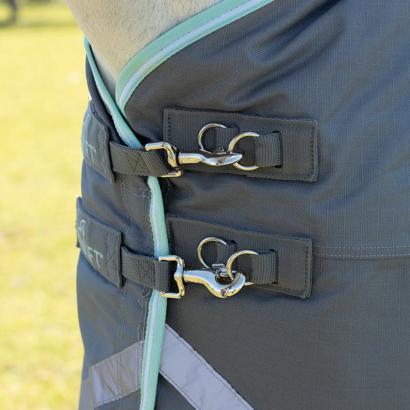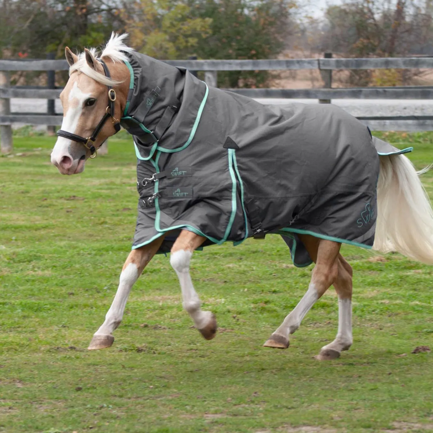 Waterproof and breathable, the Swift Rainsheet features a durable Teflon-coated 1200 denier outer shell with a 210T antibacterial lining to helps with odour control. An extended tail flap offers extra coverage while elasticized shoulder gussets help enhance freedom of movement and comfort for your pony. Complete with stretchy a tail cord and compatible with the Swift Hood (sold separately). 0 g fill.