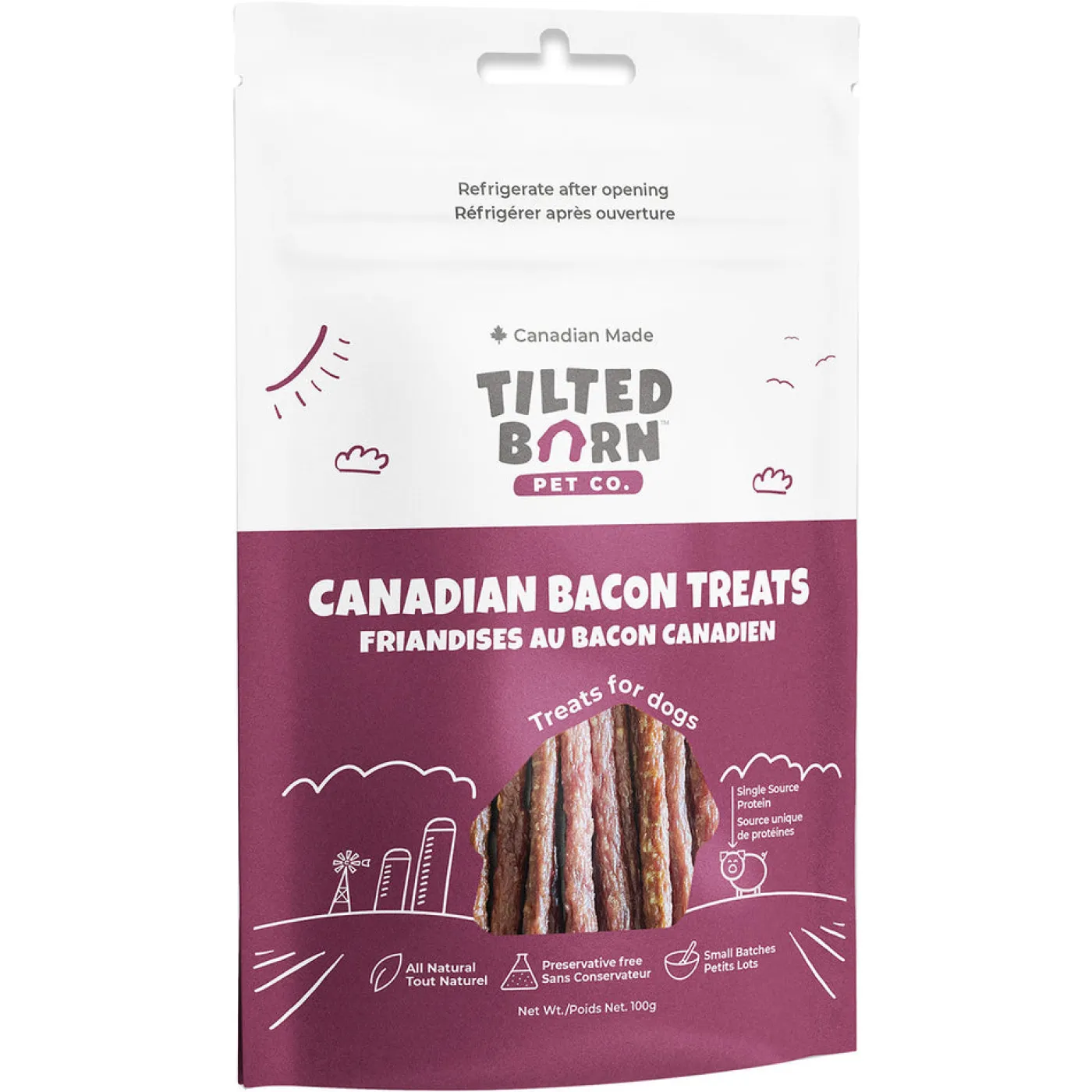 The Tilted Barn Canadian Bacon Treats are healthy, soft meaty treats for dogs of all ages and sizes. Preservative-free and contain no fillers or by-products. Made from single-source protein with all-natural, high-quality, whole ingredients from the human food market sourced from across the Canadian Prairies, and are 100% Canadian-made.
