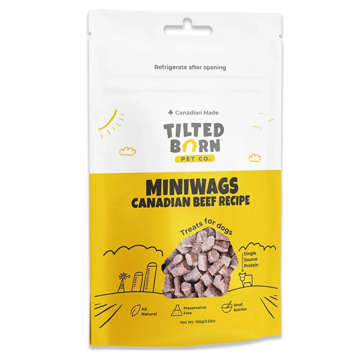 The Tilted Barn Canadian Beef Miniwags are healthy, soft meaty treats for dogs of all ages and sizes. Preservative-free and contain no fillers or by-products. Made from single-source protein with all-natural, high-quality, whole ingredients from the human food market sourced from across the Canadian Prairies, and are 100% Canadian-made.