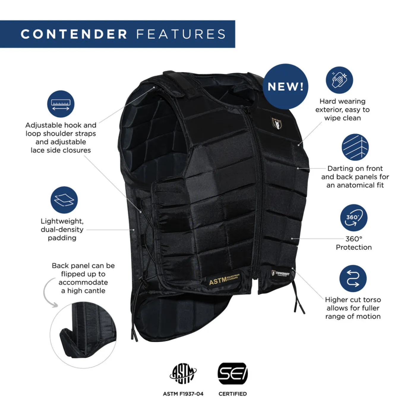 Offering lightweight, adjustable comfort, the Tipperary Contender ASTM Body Protector features lace up sides for a customized fit and a zippered front for easy on and off. Adjustable shoulder straps help ensure optimal range of motion. Ideal for all disciplines, this vest offers style, versatility, and comfort at an affordable price. ASTM & SEI certified.
