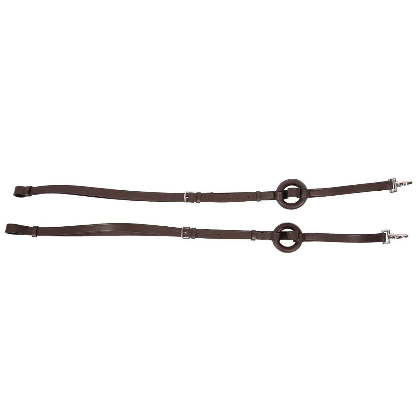 Leather side reins feature a high quality donut, allowing more give than plain leather side reins and less give than those with an elastic inset. Durable buckle on each rein allows you to adjust the side reins to achieve the ideal length for your horse. Sold as a pair.