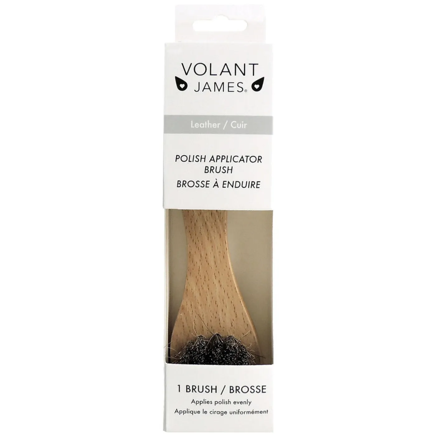 The Volant James® Polish Applicator Brush is a top quality brush with 100% horsehair bristles set in a sturdy wooden handle. Applies polish evenly on footwear, especially around the sole edges. Perfect to use with Volant James Premium Wax Shoe Polish.