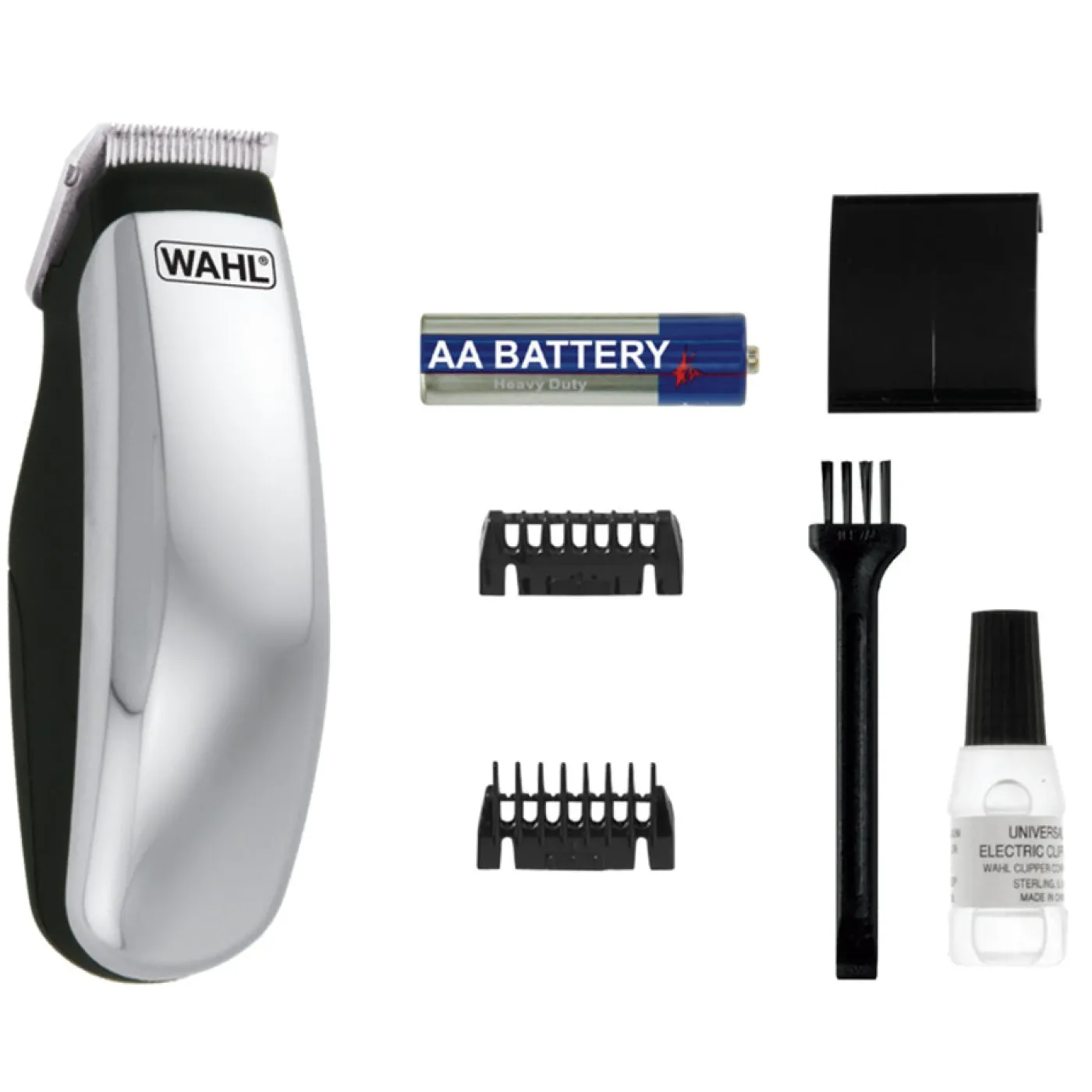 - Includes (x1) AA battery, blade oil, cleaning brush, (x2) attachment guide combs, travel pouch & instructions