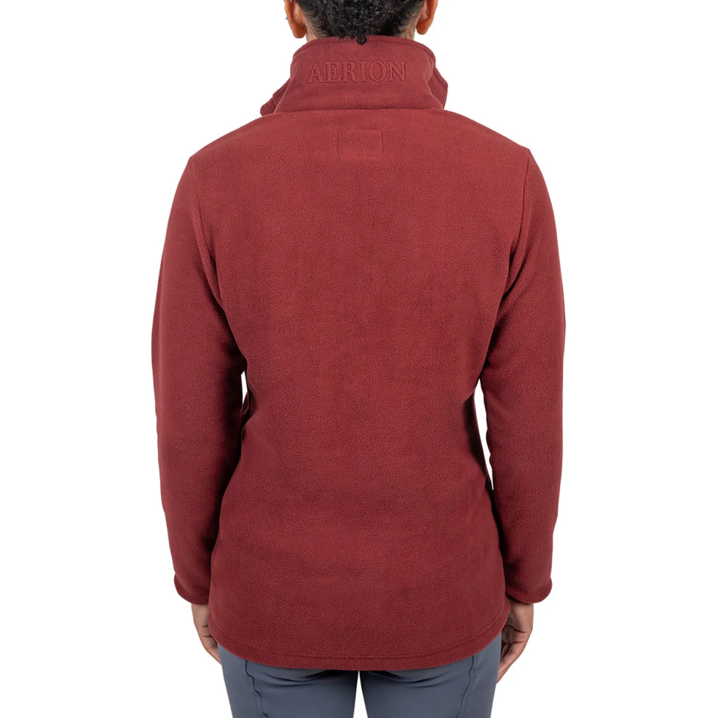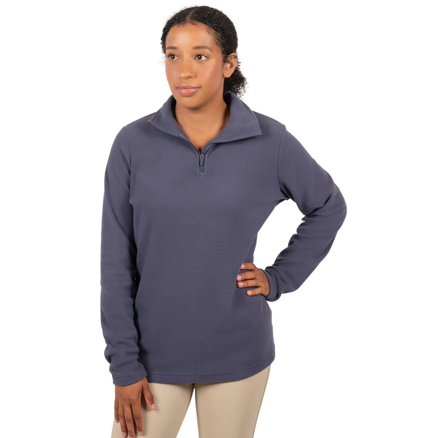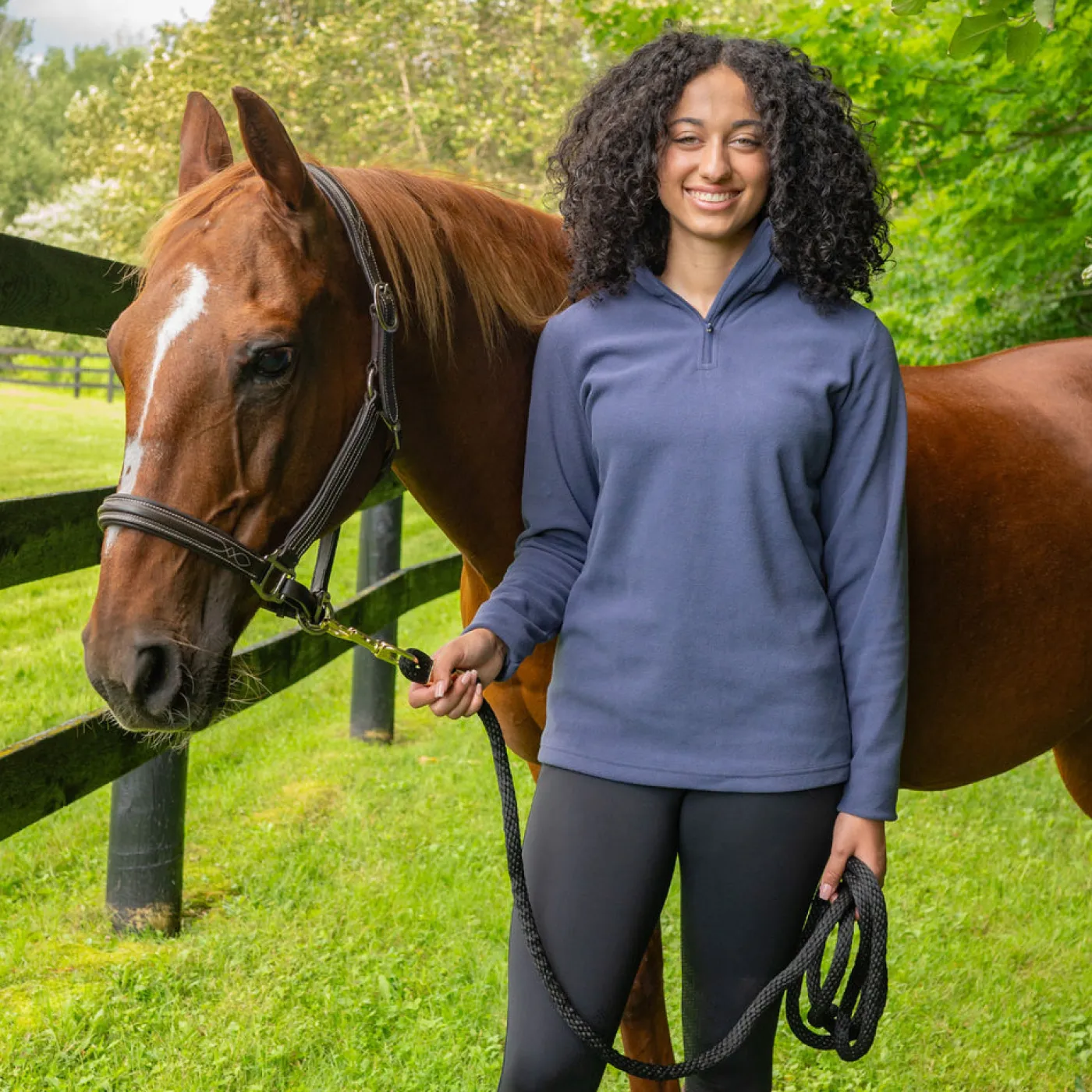The Aerion Rowan Fleece 1/4 Zip Top offers a functional fleece top with a high collar and zip flap. Suitable for layering during cool weather riding and may be worn as a base layer. Features back collar embroidery for added style. Breathable and quick-drying.