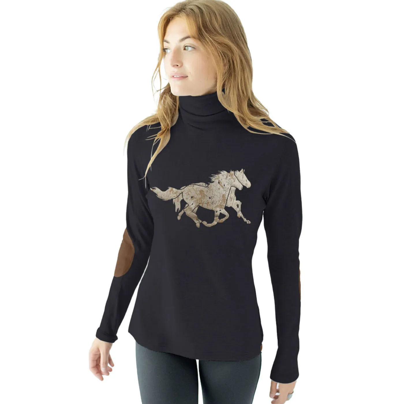 This pull-over style turtleneck sweater has a perfect height collar combined with an uncompromised semi-fitted shape that sits at the hip. Can be worn under a jacket or vest without bulk. Features soft suede elbow patches and a touch of metallic shine with an adorable Running Horses print. The hyper-cozy fabric with a brushed heathered feel makes this a perfect fall favorite.