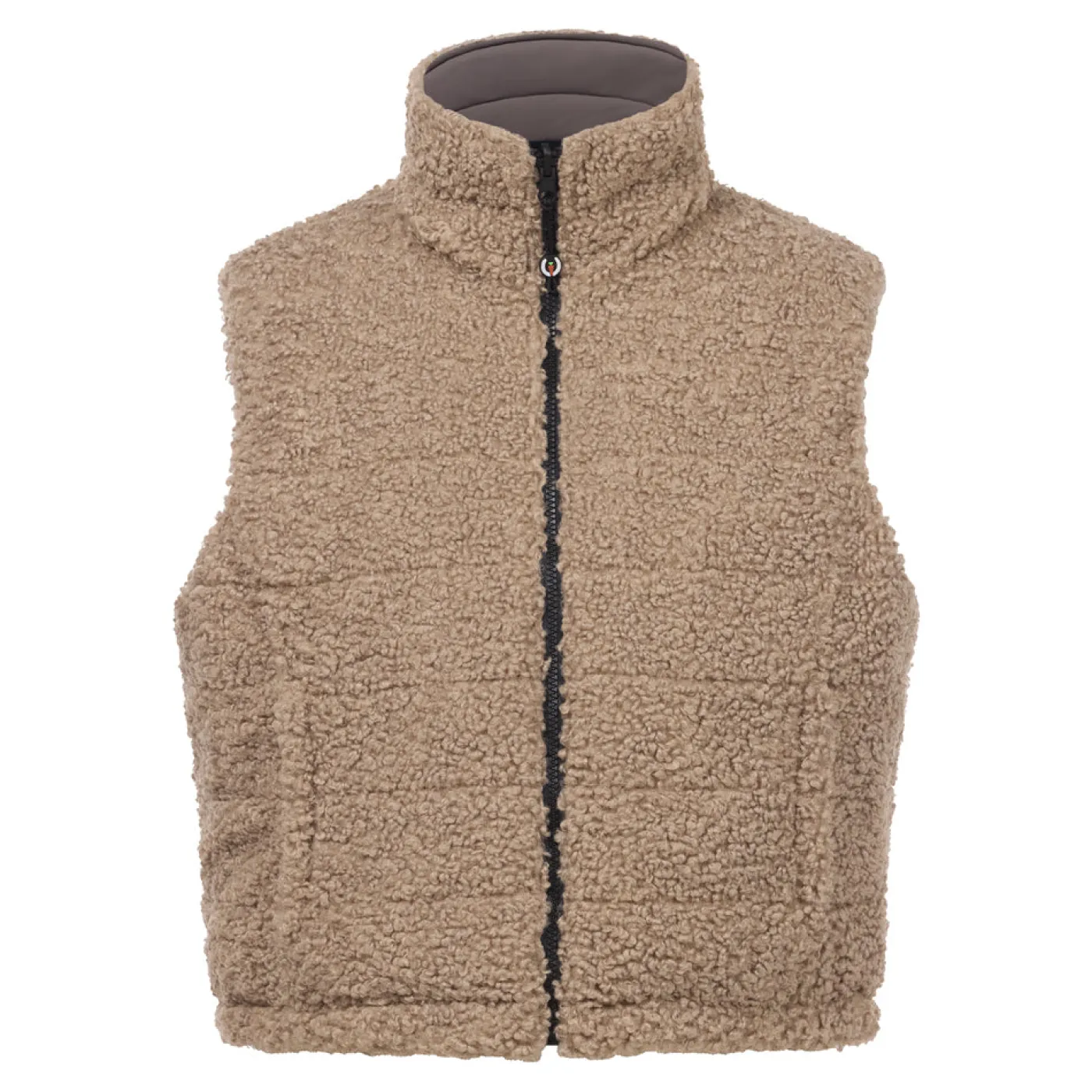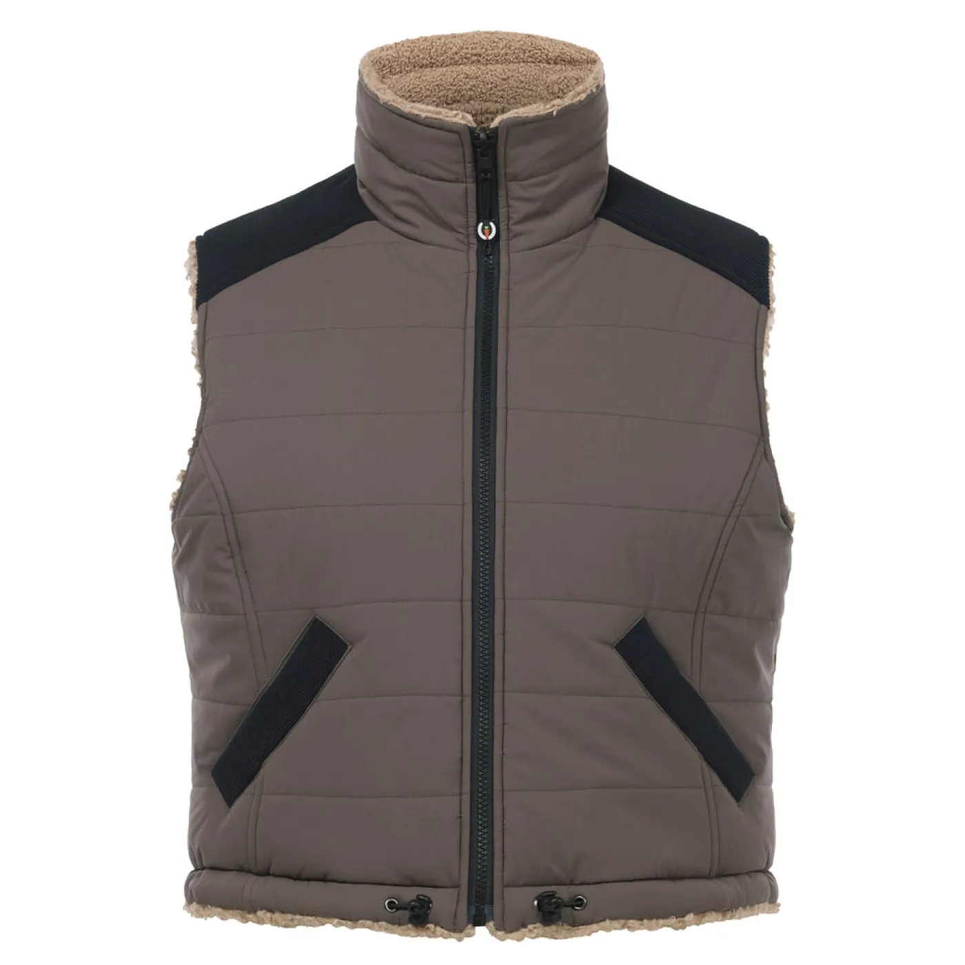 Kick up your riding wardrobe with this reversible vest – a fun and fashionable layering piece with a cropped silhouette that adds a modern vibe to any outfit. Enjoy two looks in one, featuring a classic smooth canvas on one side and playful cozy sherpa fleece on the other, all quilted with 140 g of poly-loft fill for core warmth. The tall collar, adjustable draw cord waist, and pockets on both sides provide comfort and practicality, ensuring style and functionality for your equestrian lifestyle.