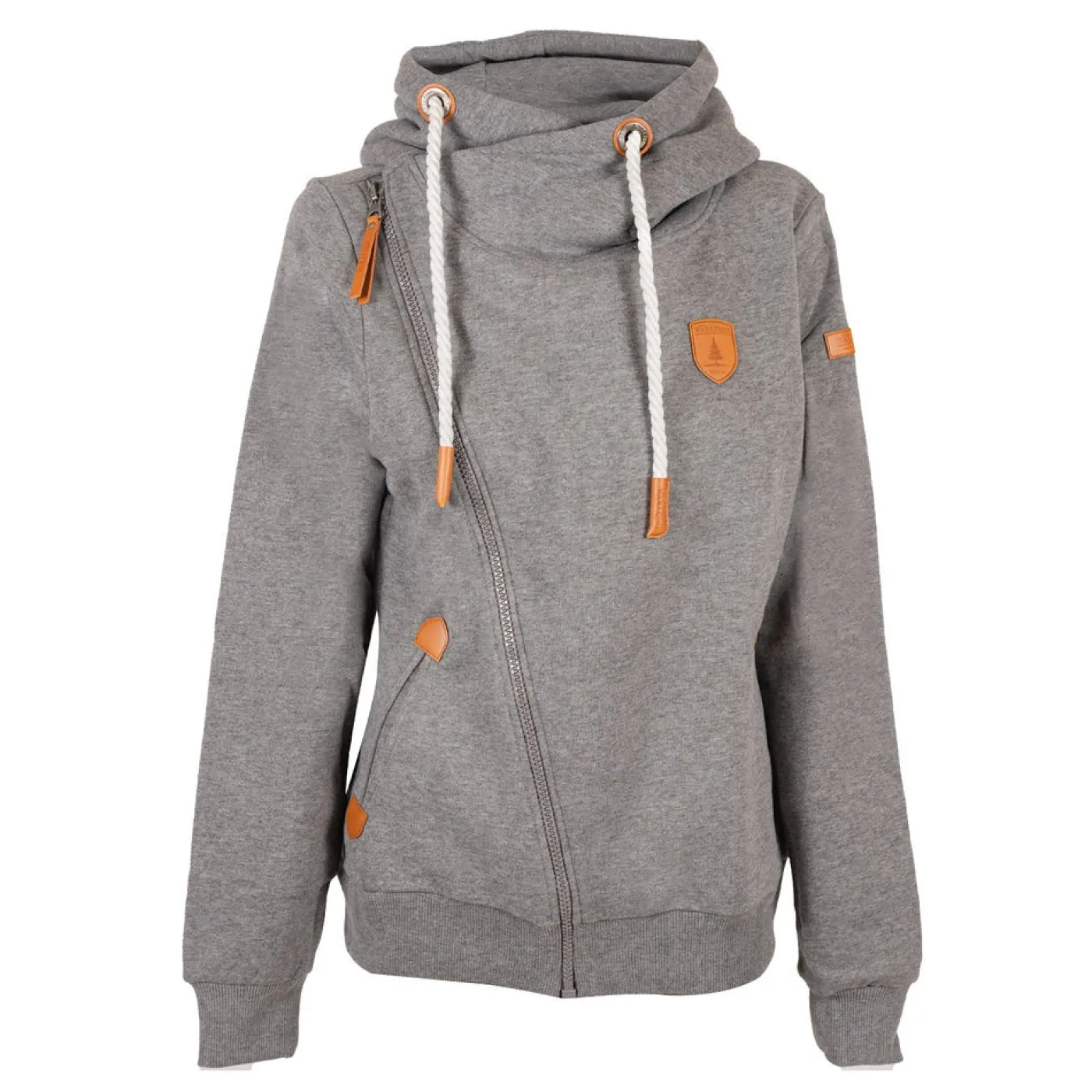 The Wanakome Athena Hoodie is perfect for layering and features a chunky neck, asymmetrical full-zip front, and faux leather accents.