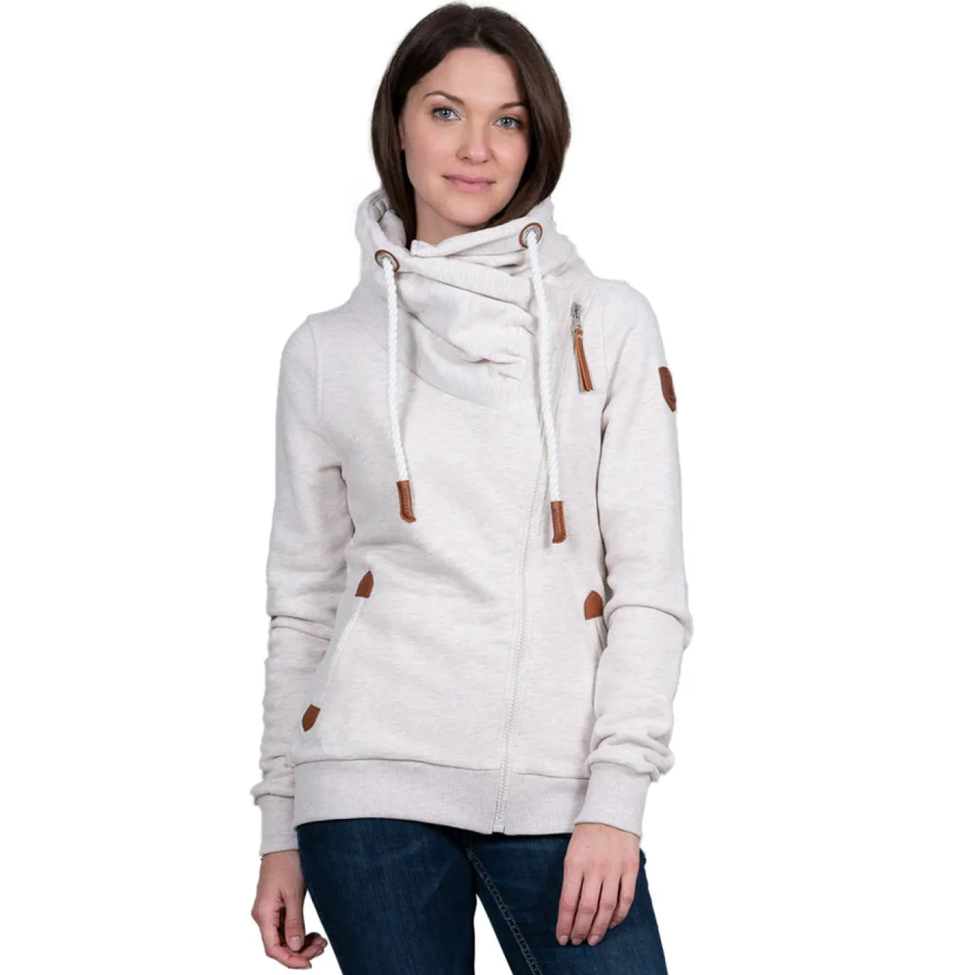 The Wanakome Hestia Full Zip Hoodie is perfect for layering and offers a cowl neck with an adjustable rope drawstring. Features a brushed French terry interior, diagonal side zipper and a vegan leather Wanakome patch logo embroidered onto the sleeve. Complete with vegan leather detailed front pockets.